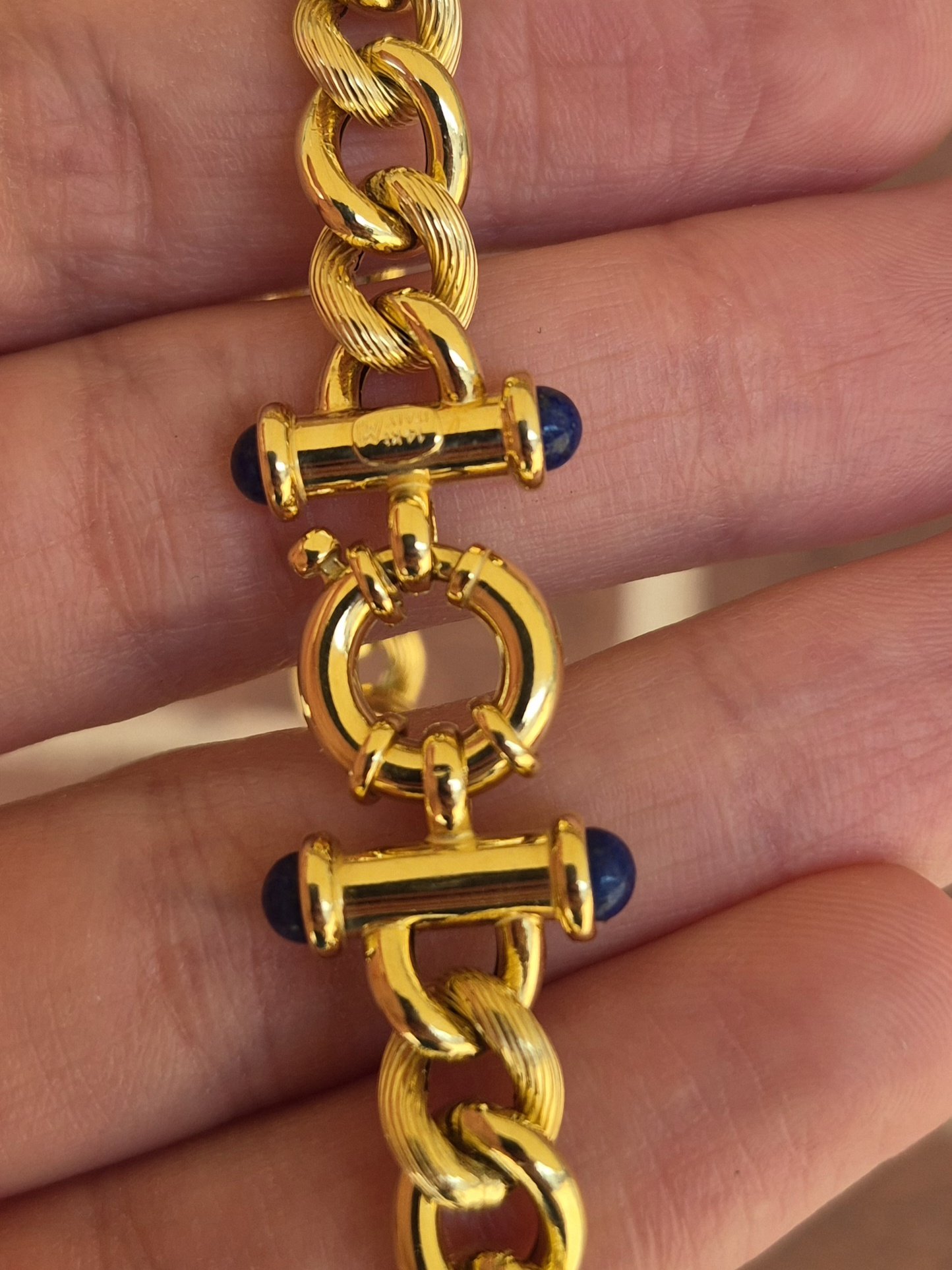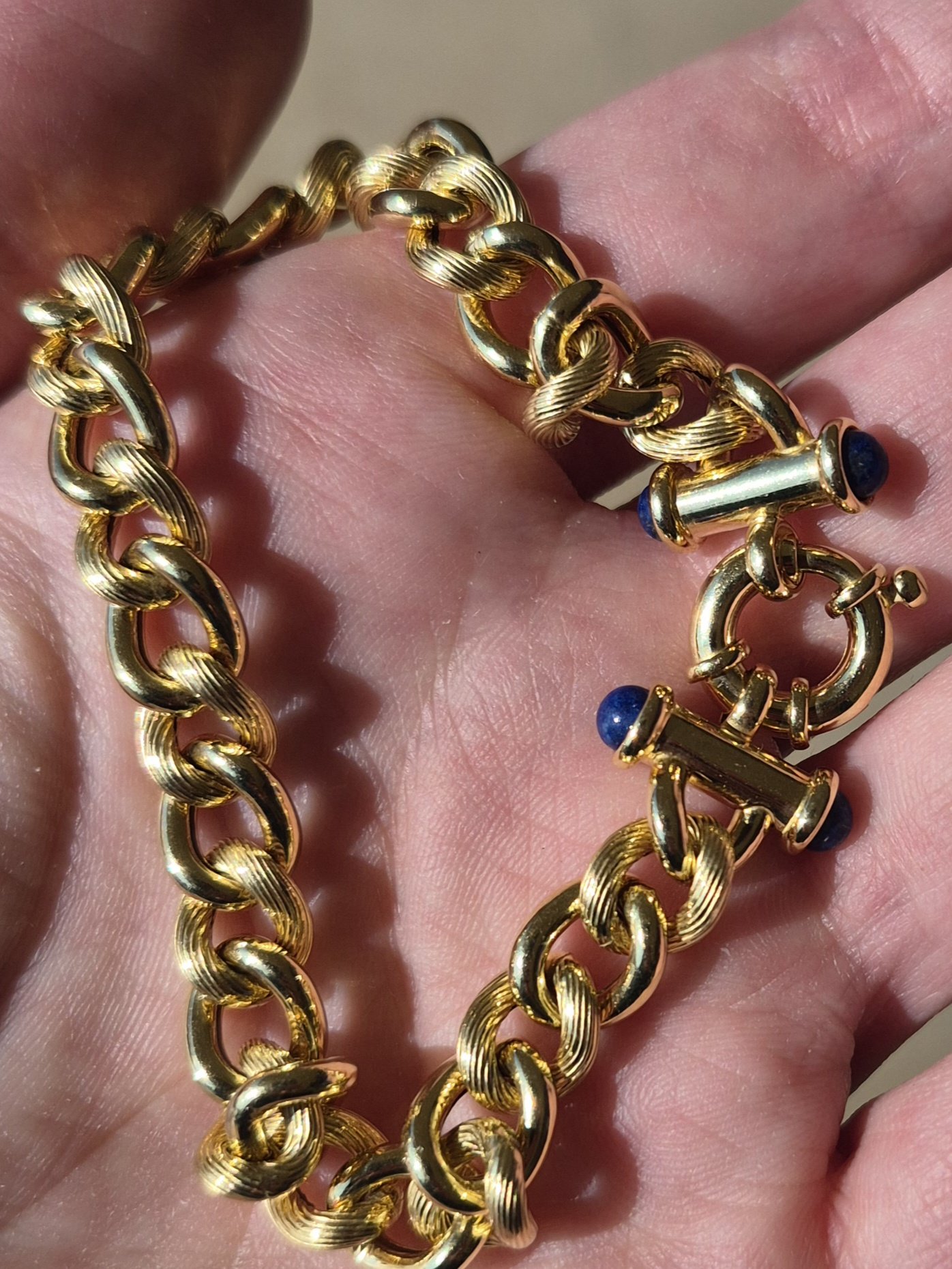 Very shiny, semi-hollow bracelet with fancy clasp. 8.4mm wide and 8 inches long
