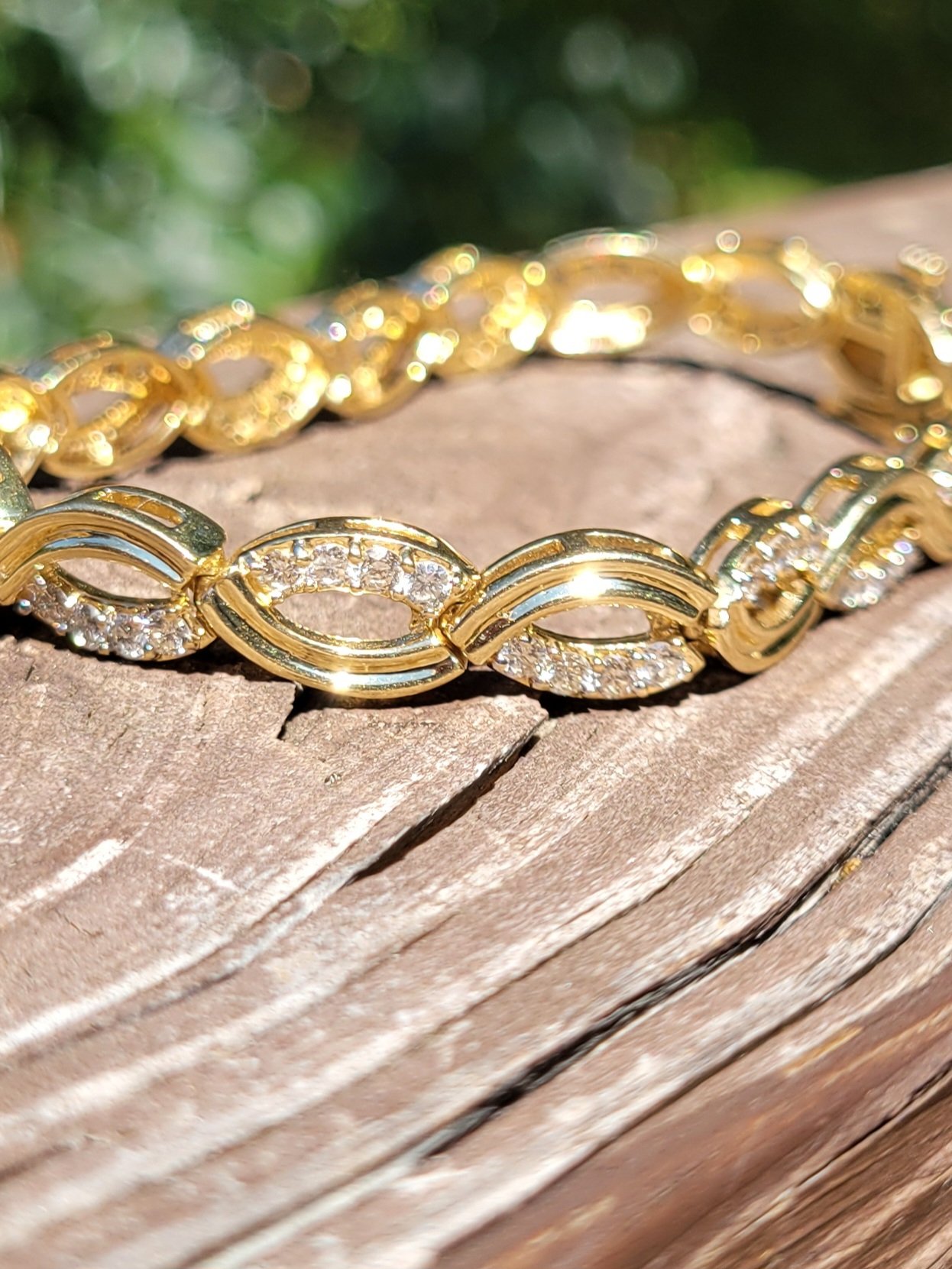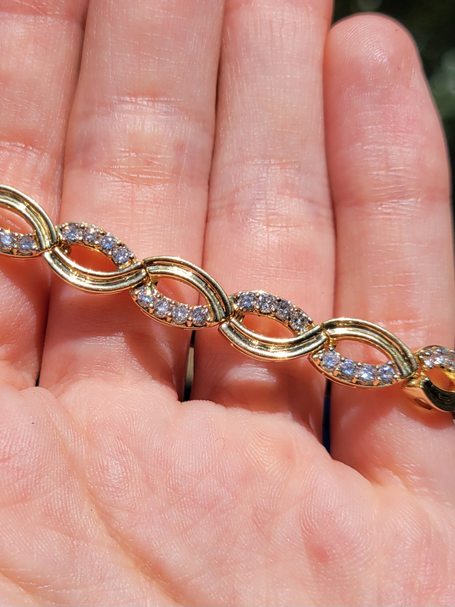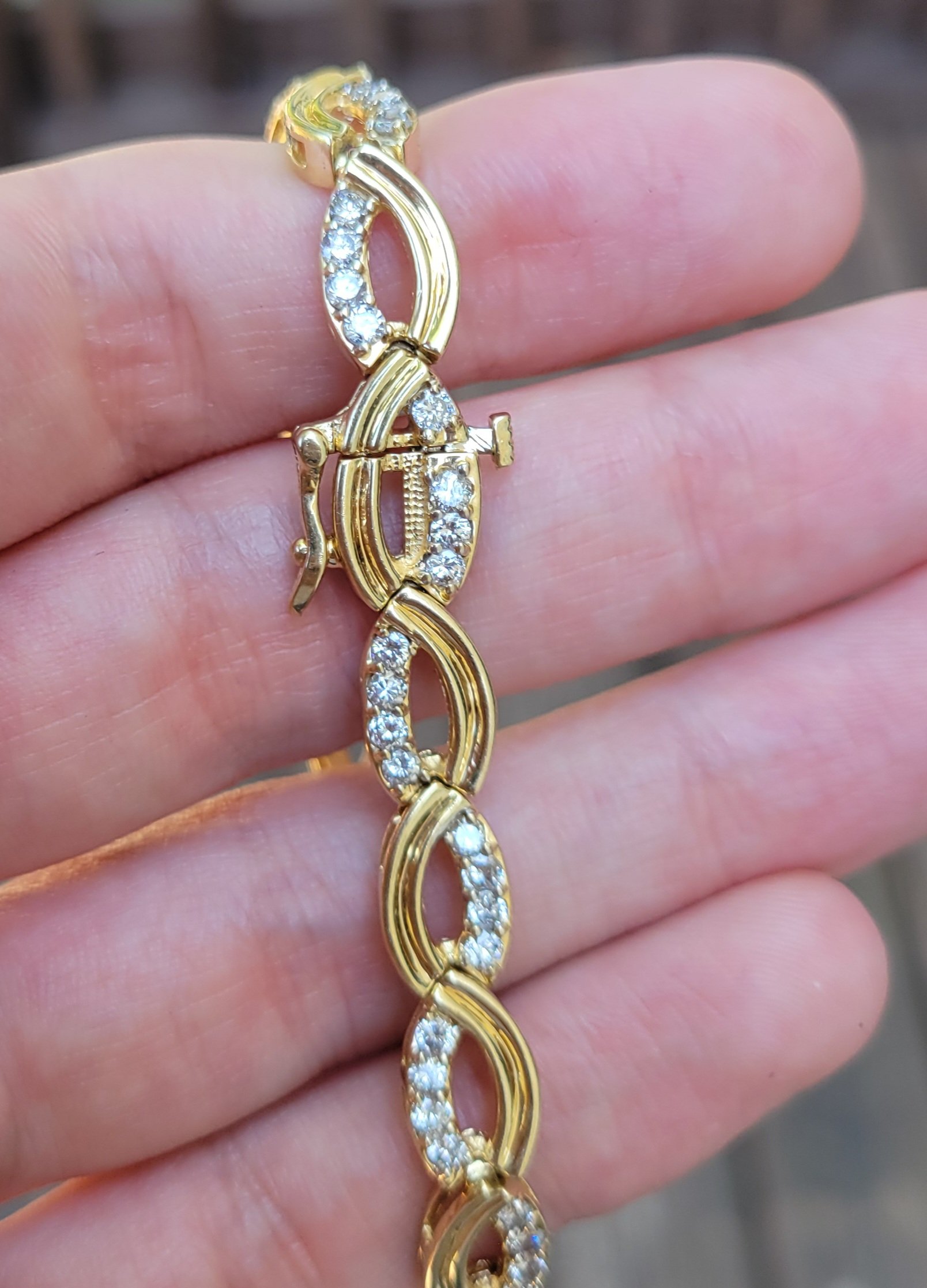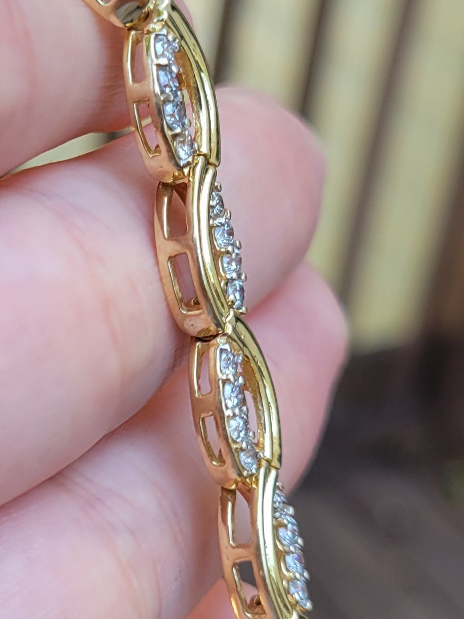 Yellow gold tennis bracelet with diamonds on each link. 7.7mm wide and 7 inches long
