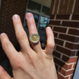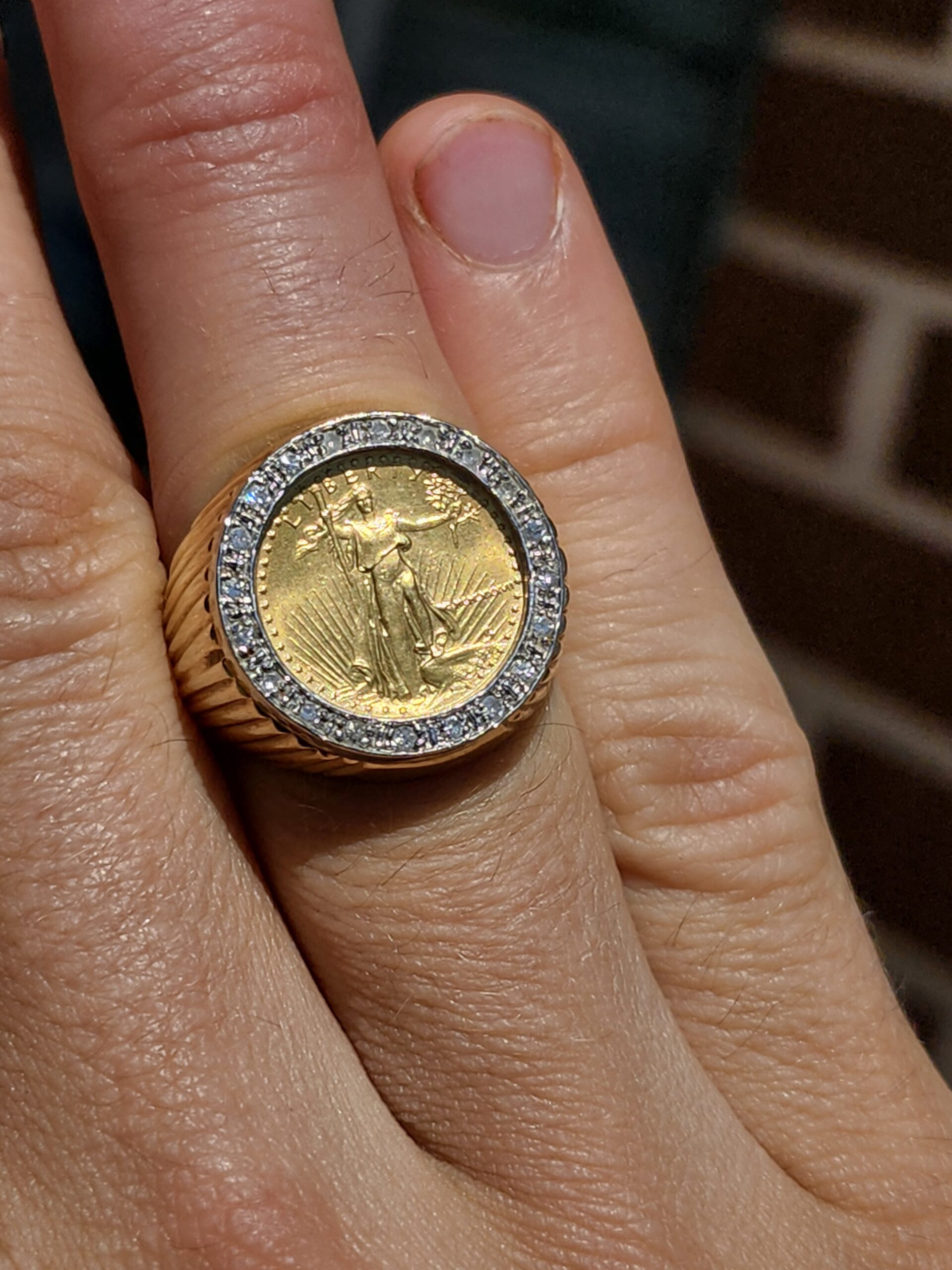 there are 11 grams of 14k gold here with a white gold diamond bezel.