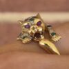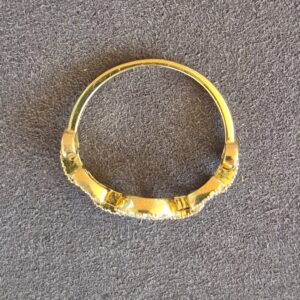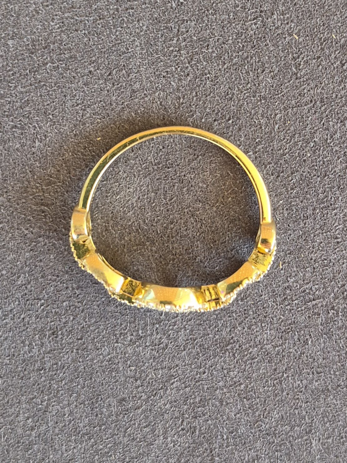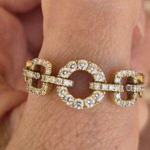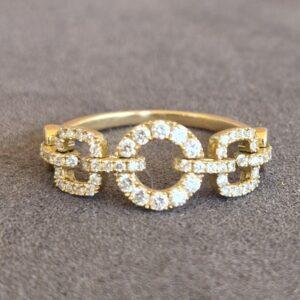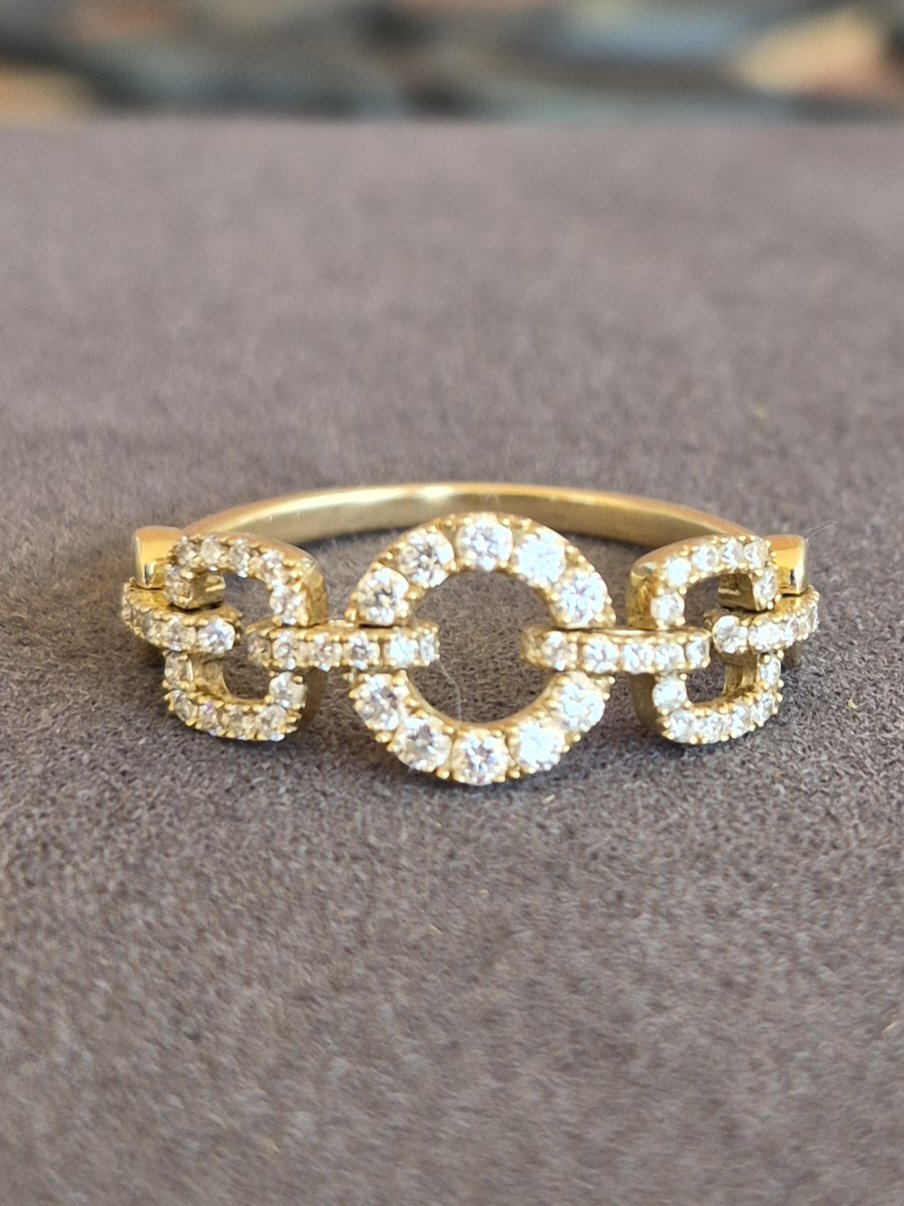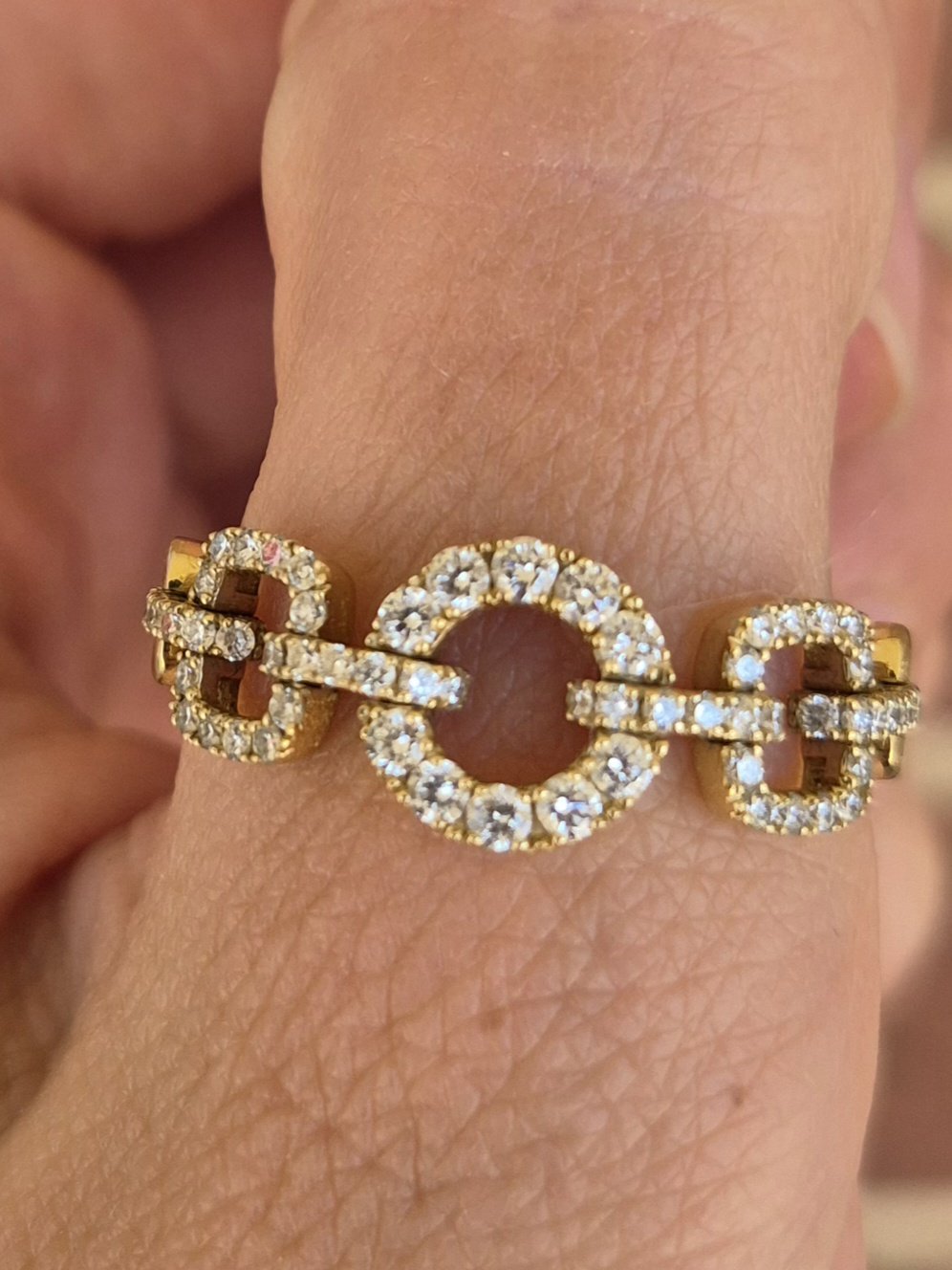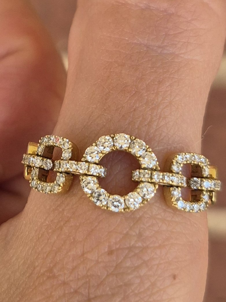 yellow gold ring with diamonds, front of ring is flexible like a chain