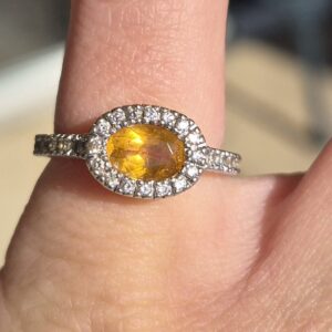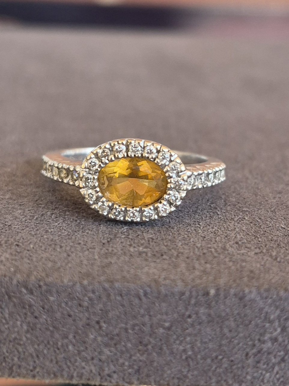 White gold ring with an east/west set yellow topaz and beautiful diamonds