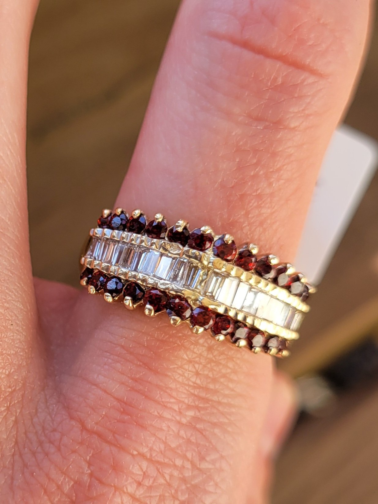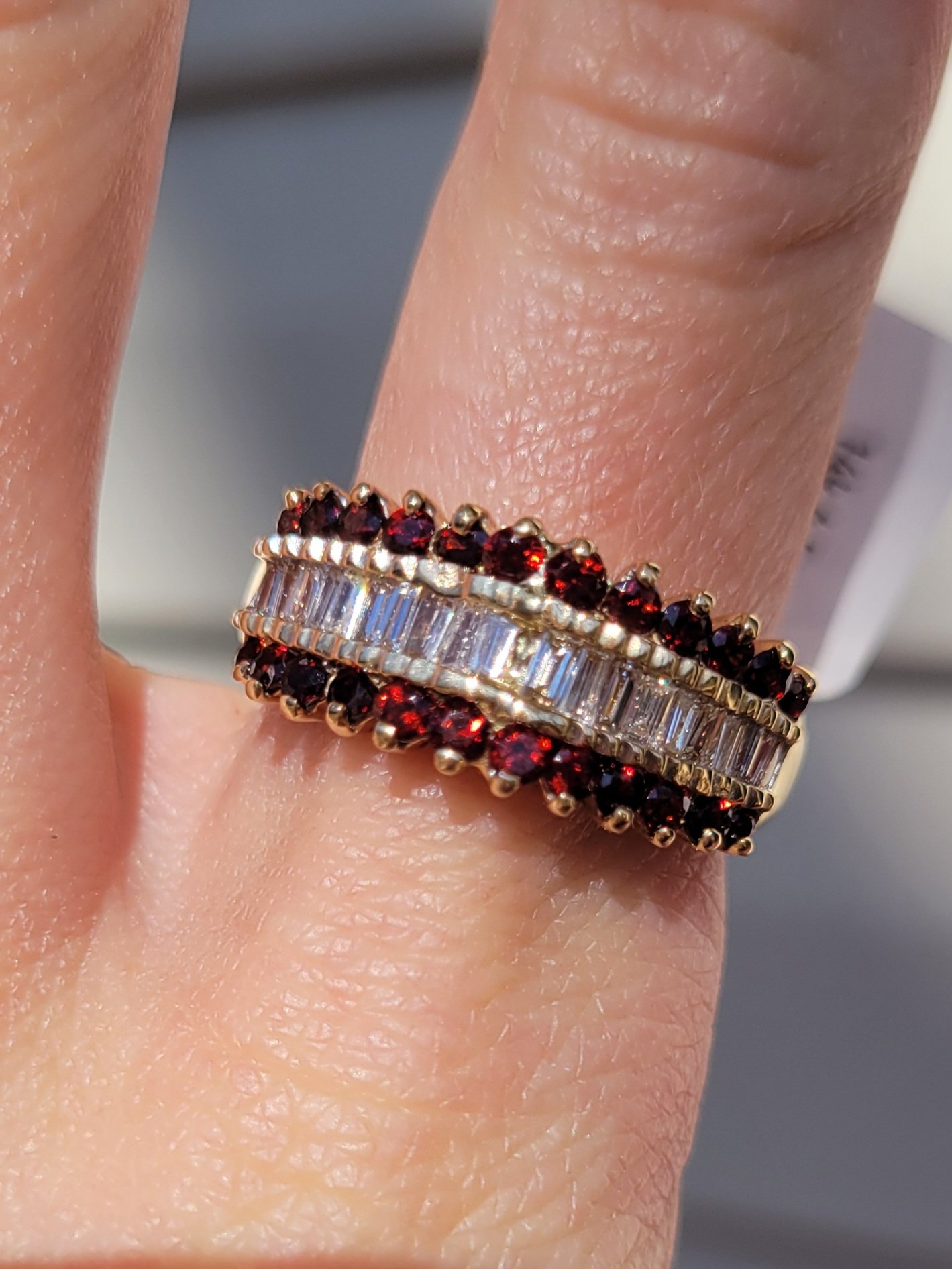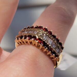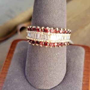 14k 6.5g diamond and garnet pyramid ring- sz8.5