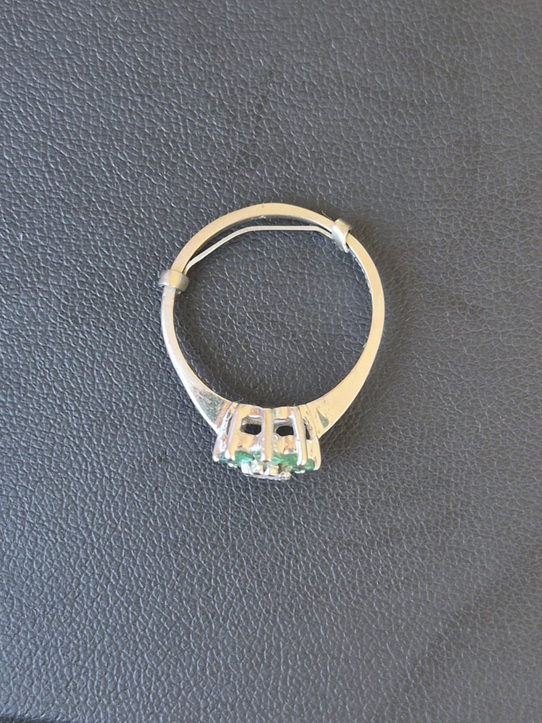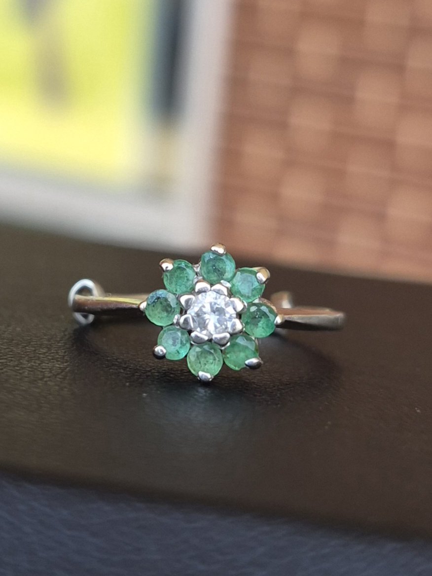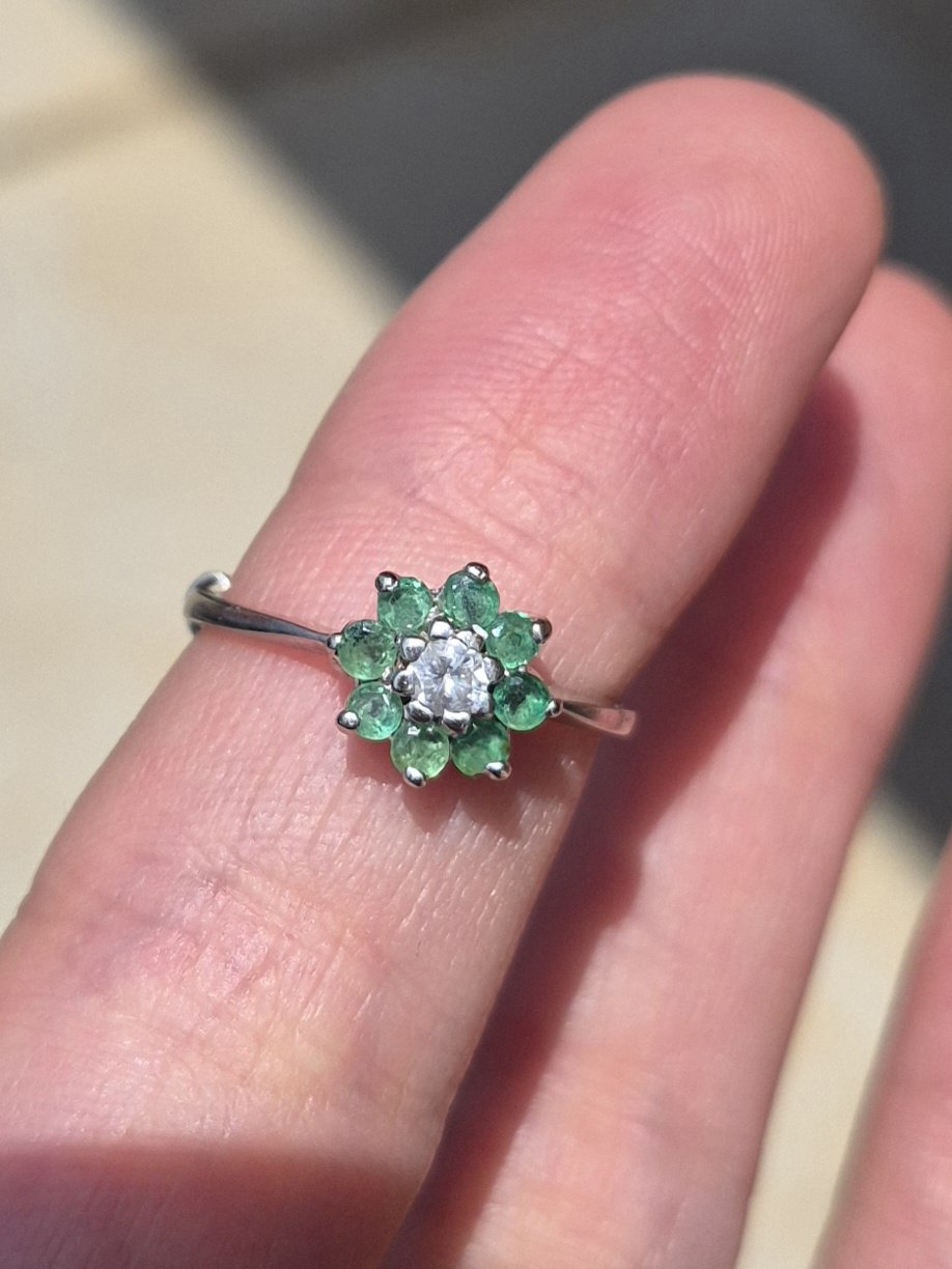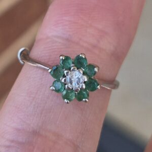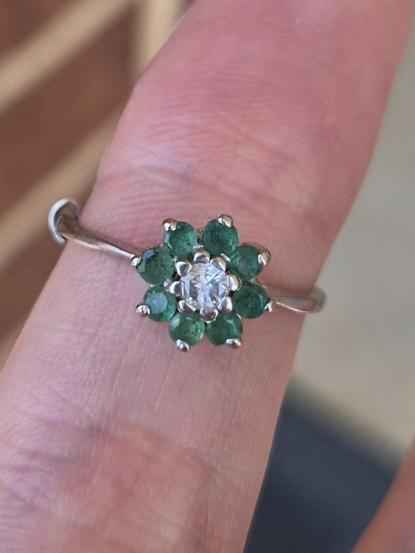 14k white gold emerald and diamond flower ring- sz6 quantity