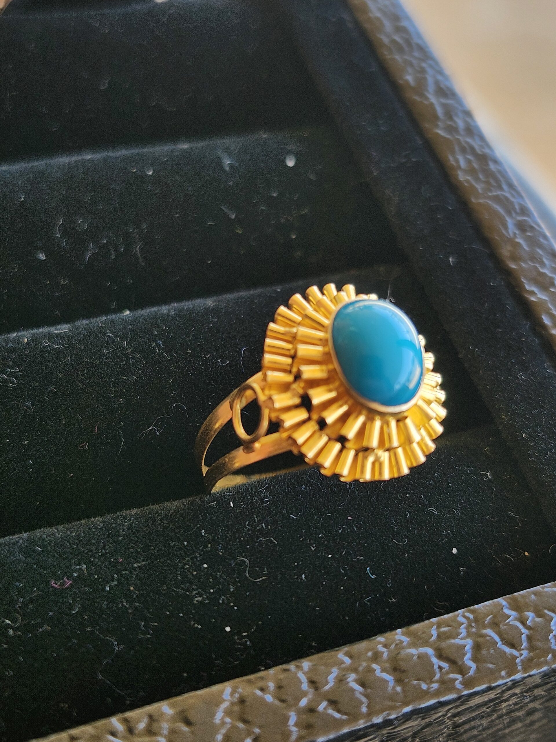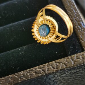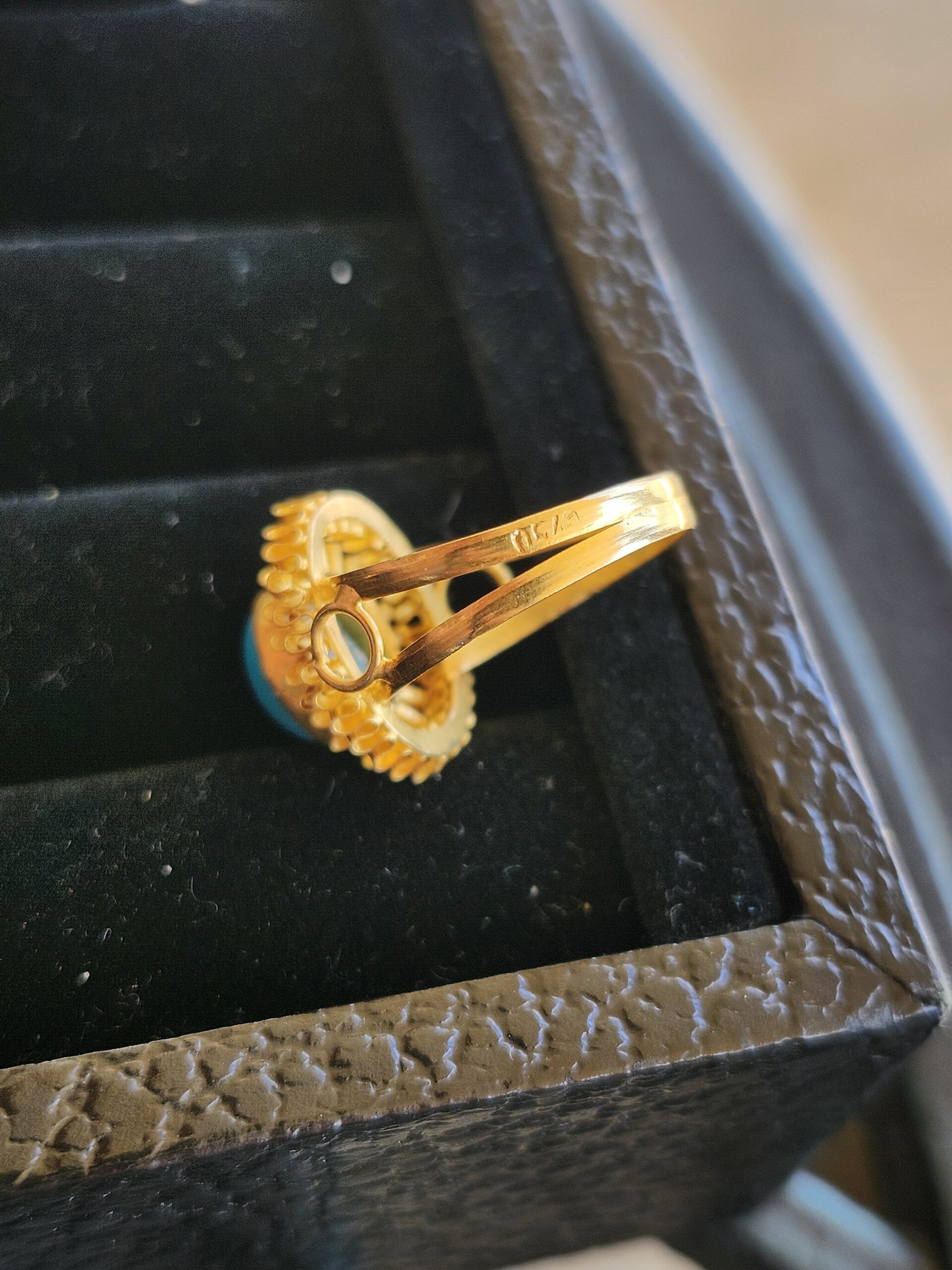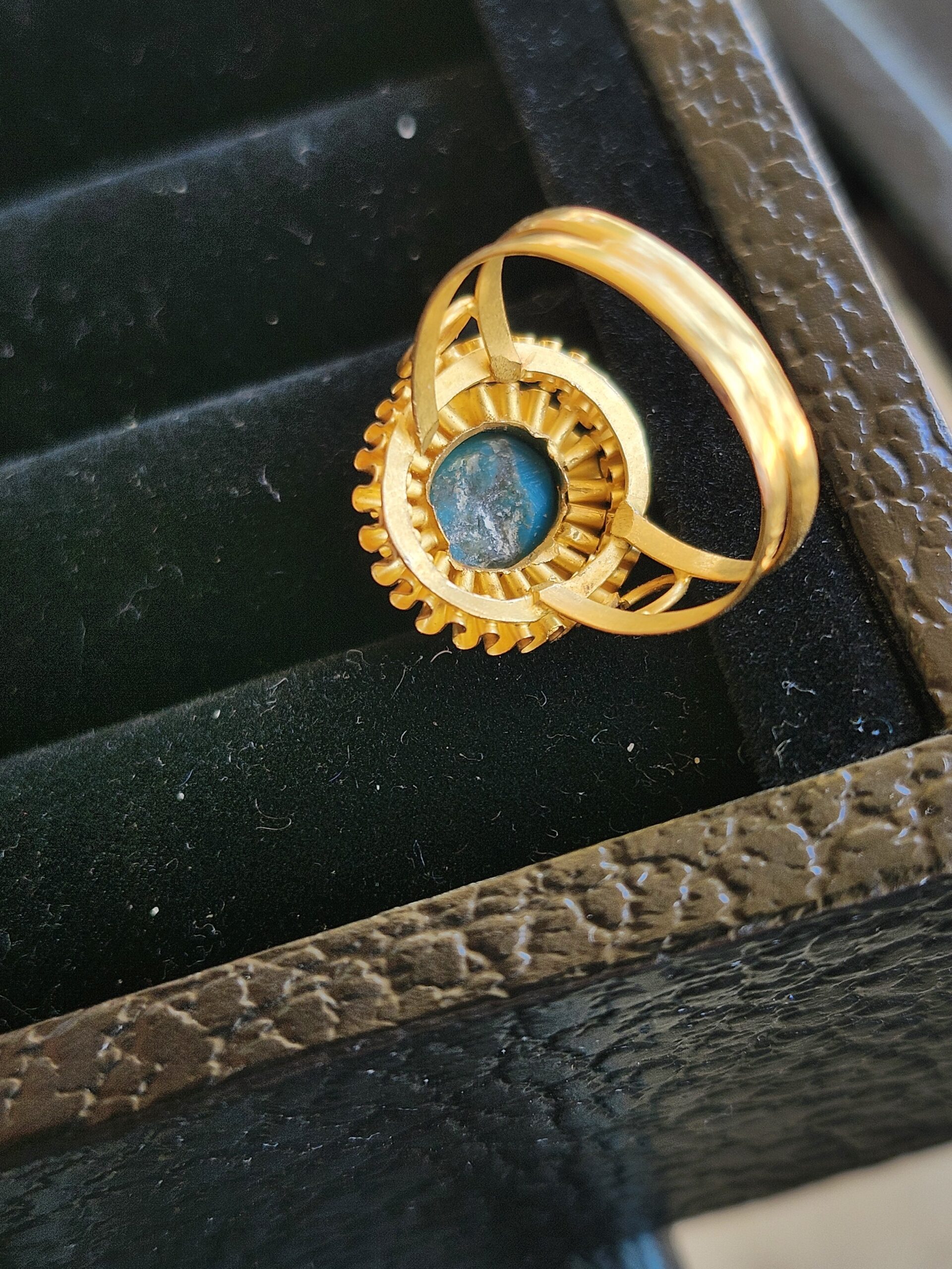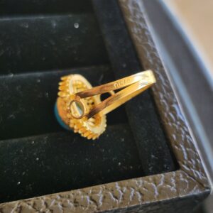 This ring looks 22k but is 18k. I really love the contrasting blue with the deep orange color of the gold.