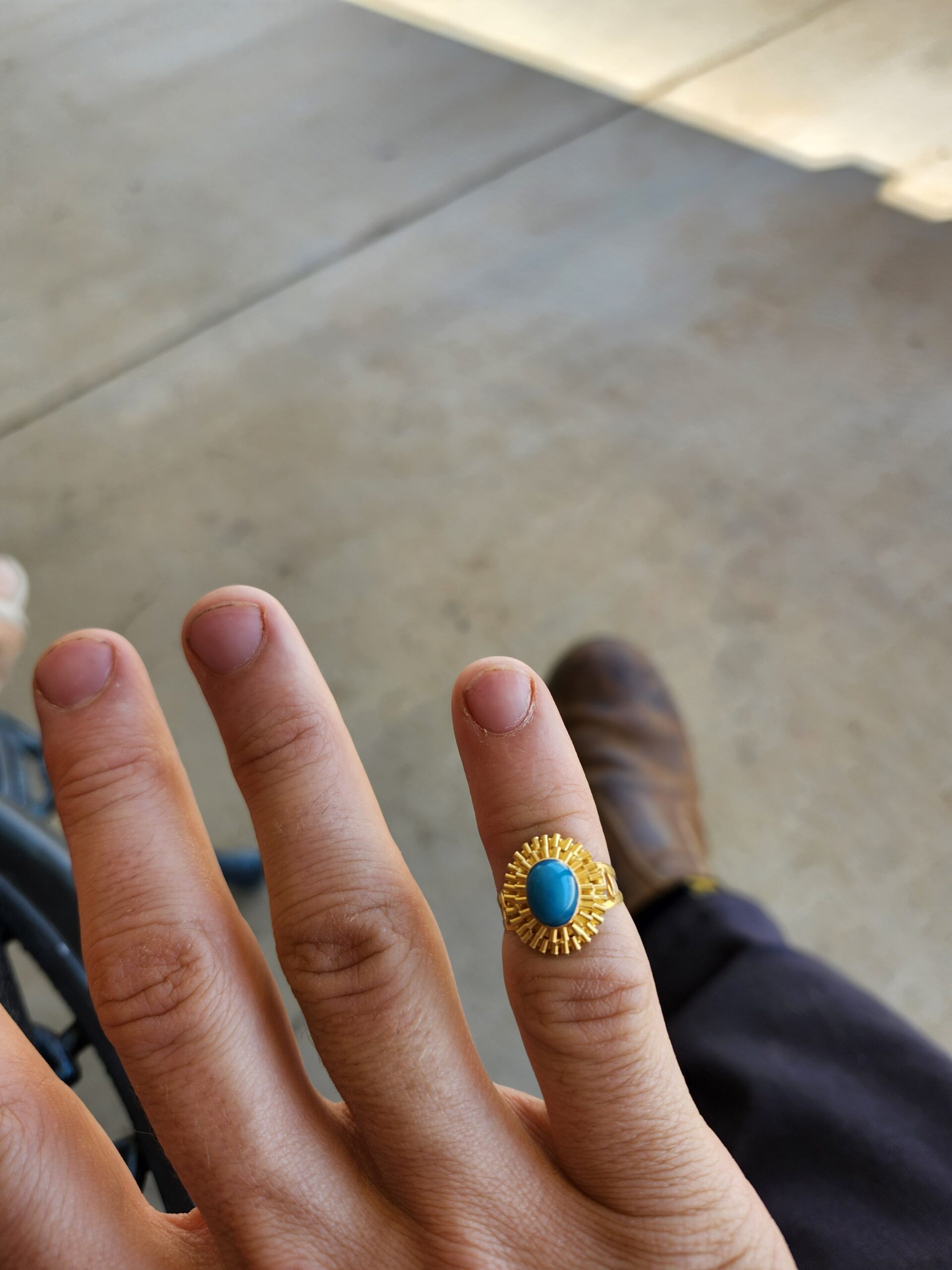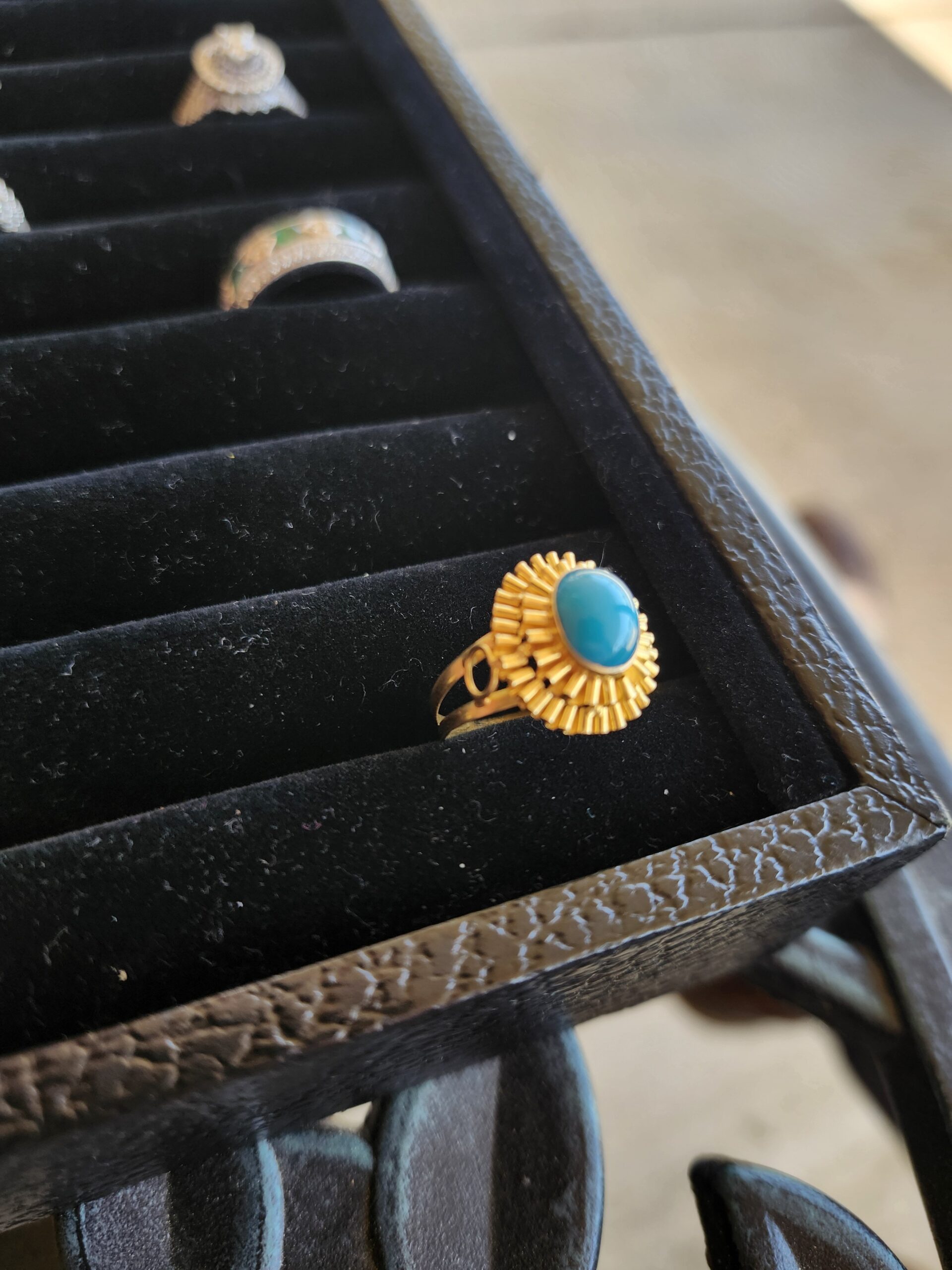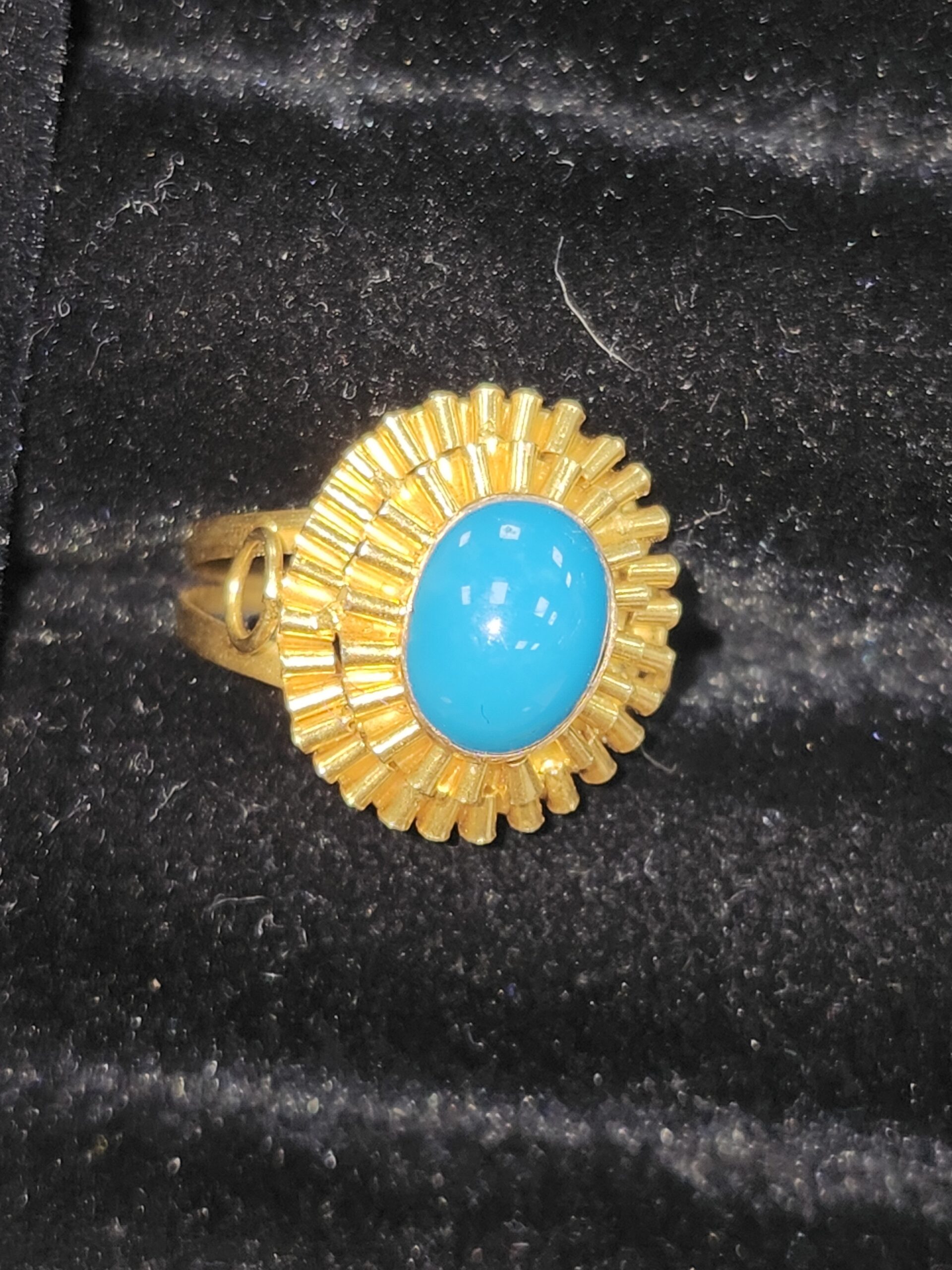 This ring looks 22k but is 18k. I really love the contrasting blue with the deep orange color of the gold.