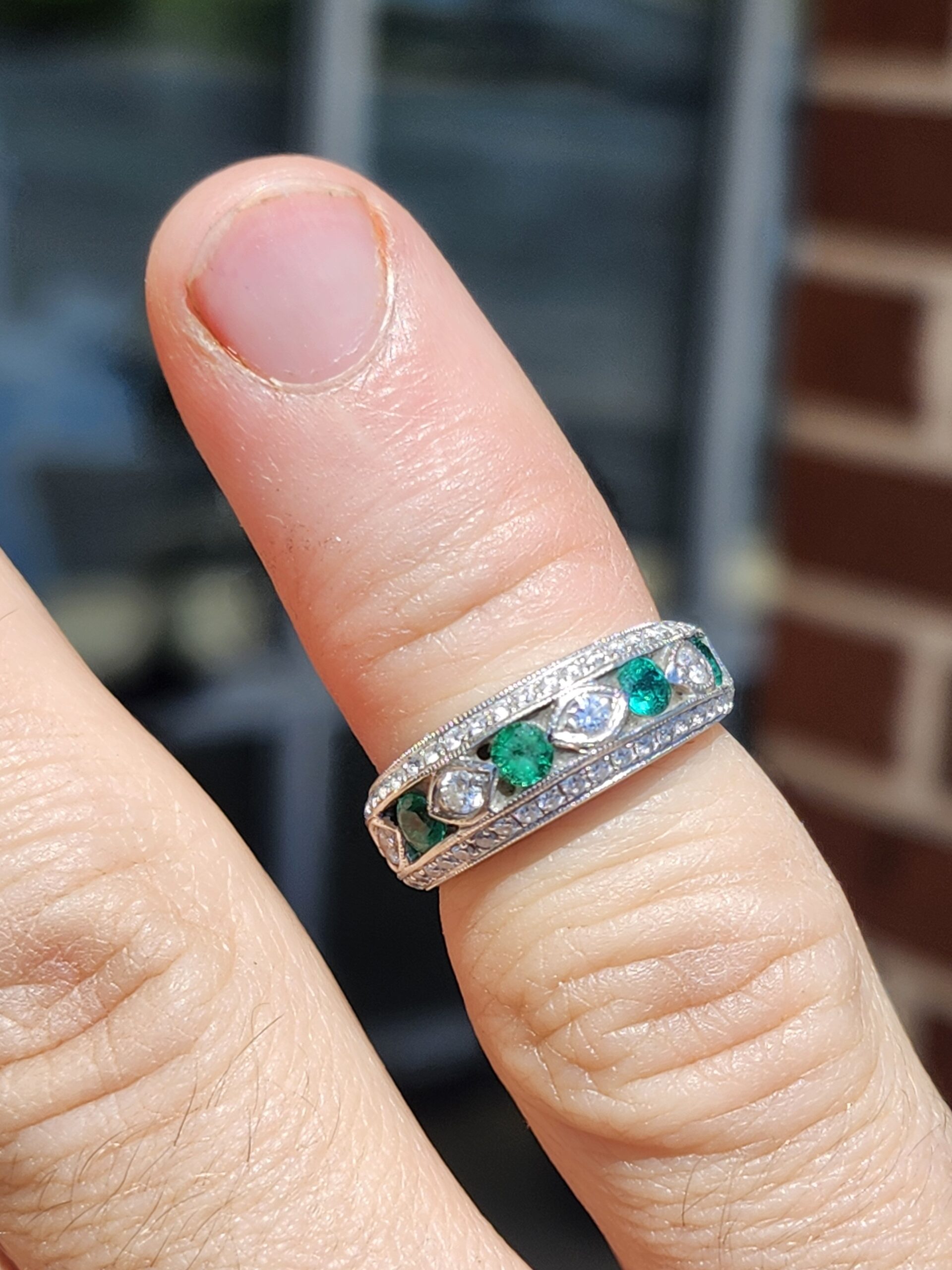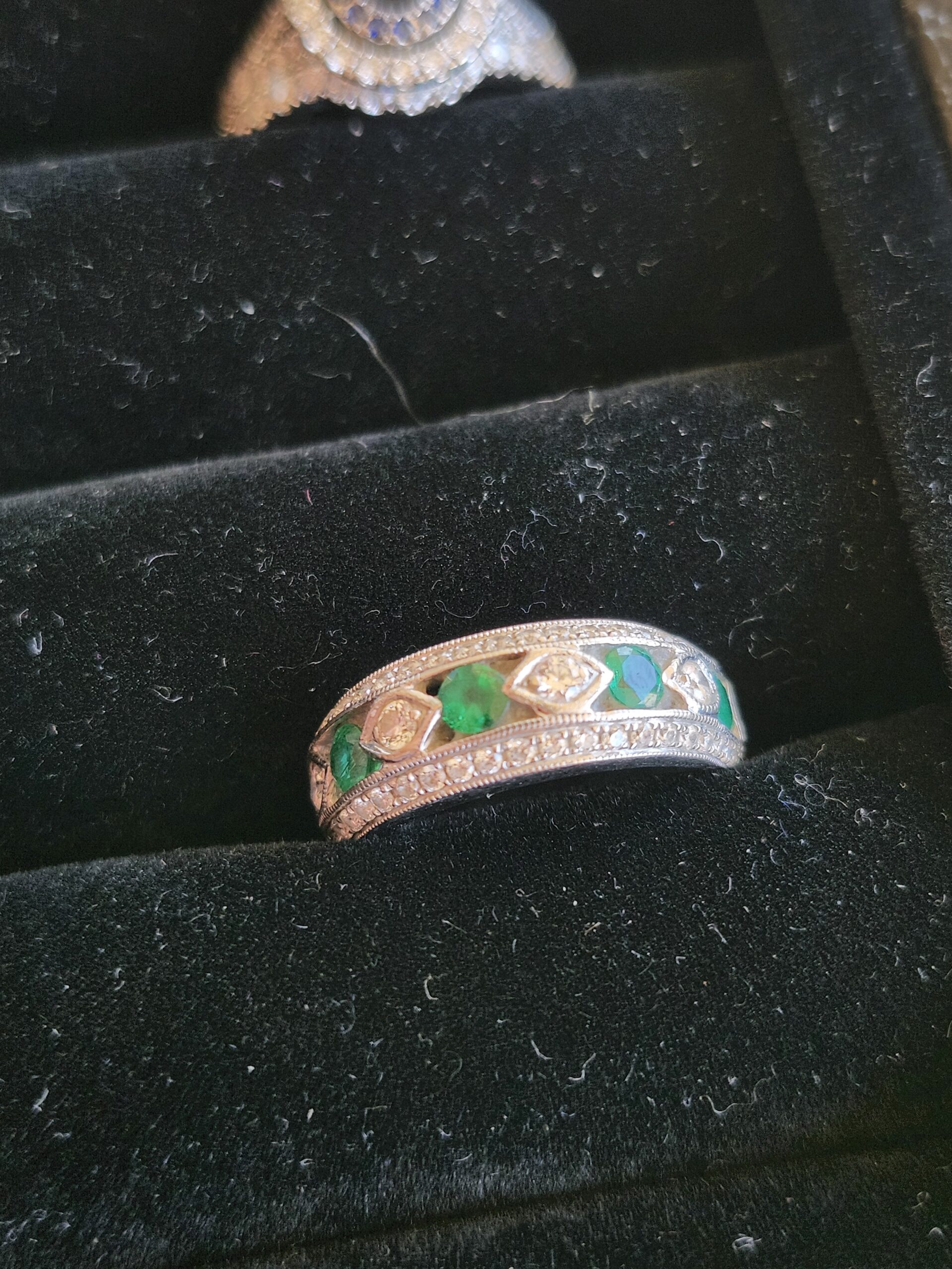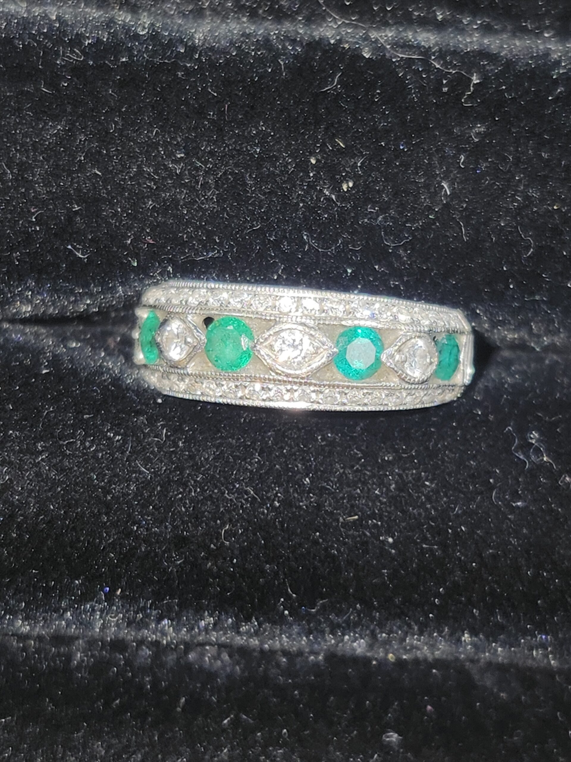 White gold and chunky yet a smaller size. this ring has alternating diamonds and Emeralds in the face and a row of natural diamonds above and below that too!