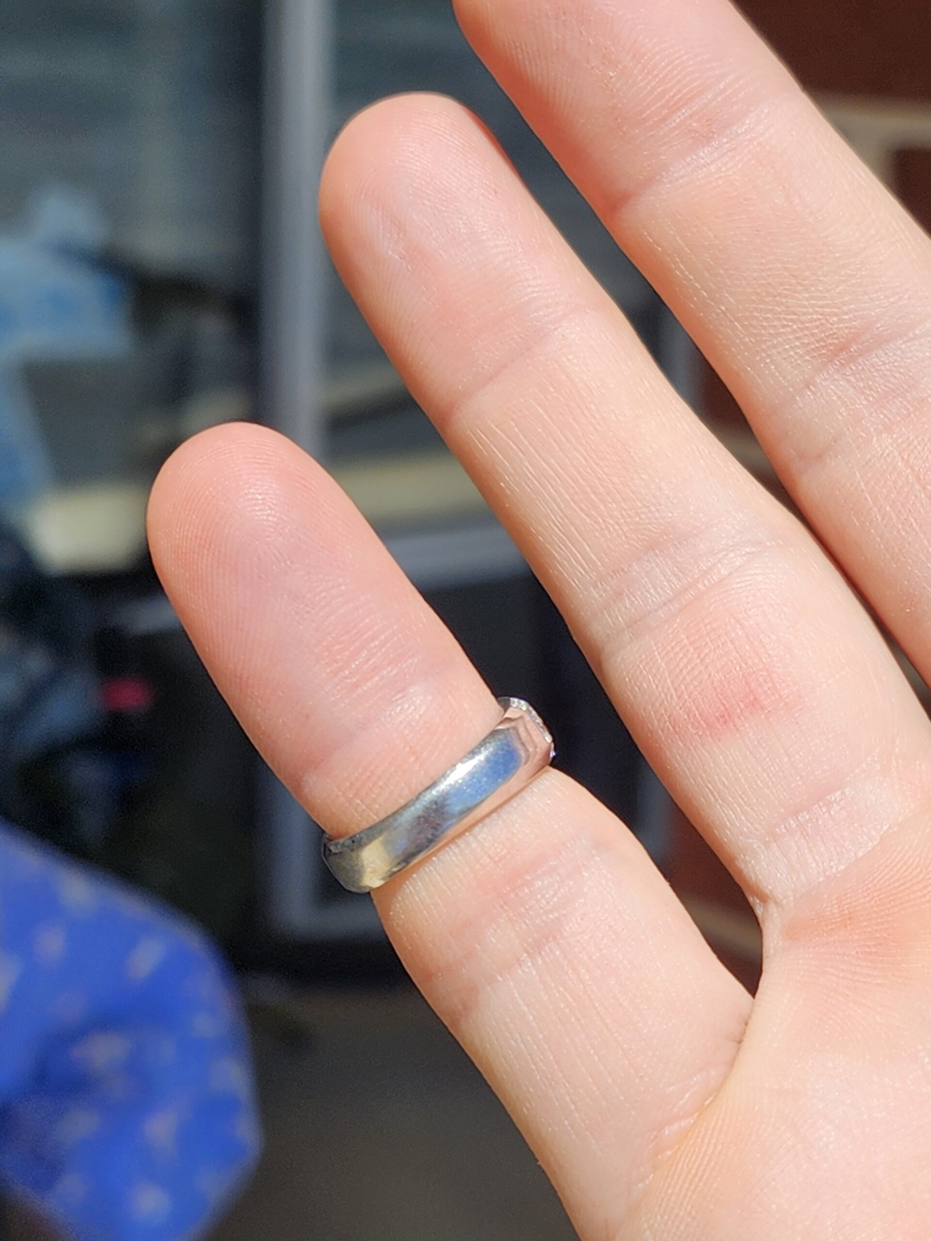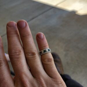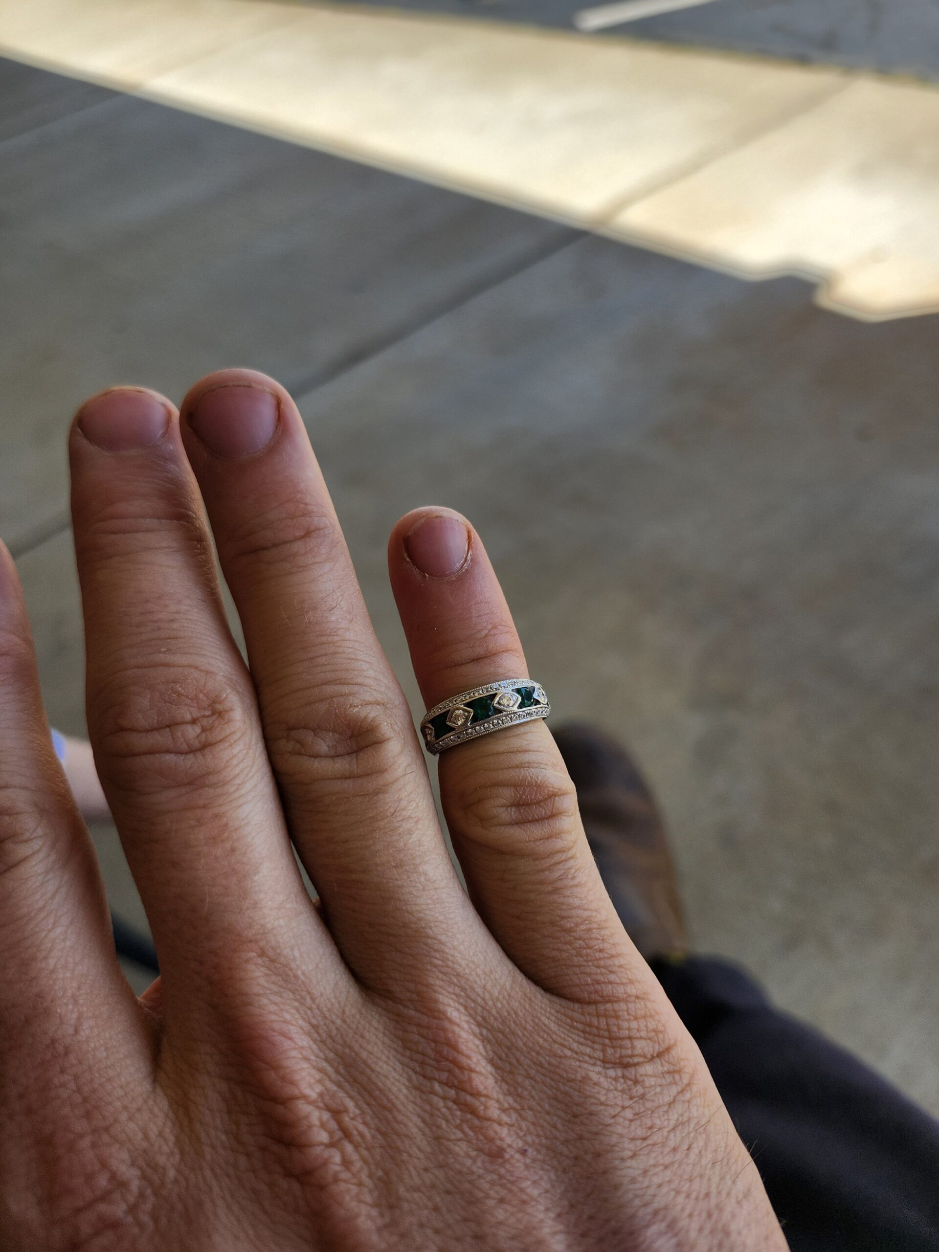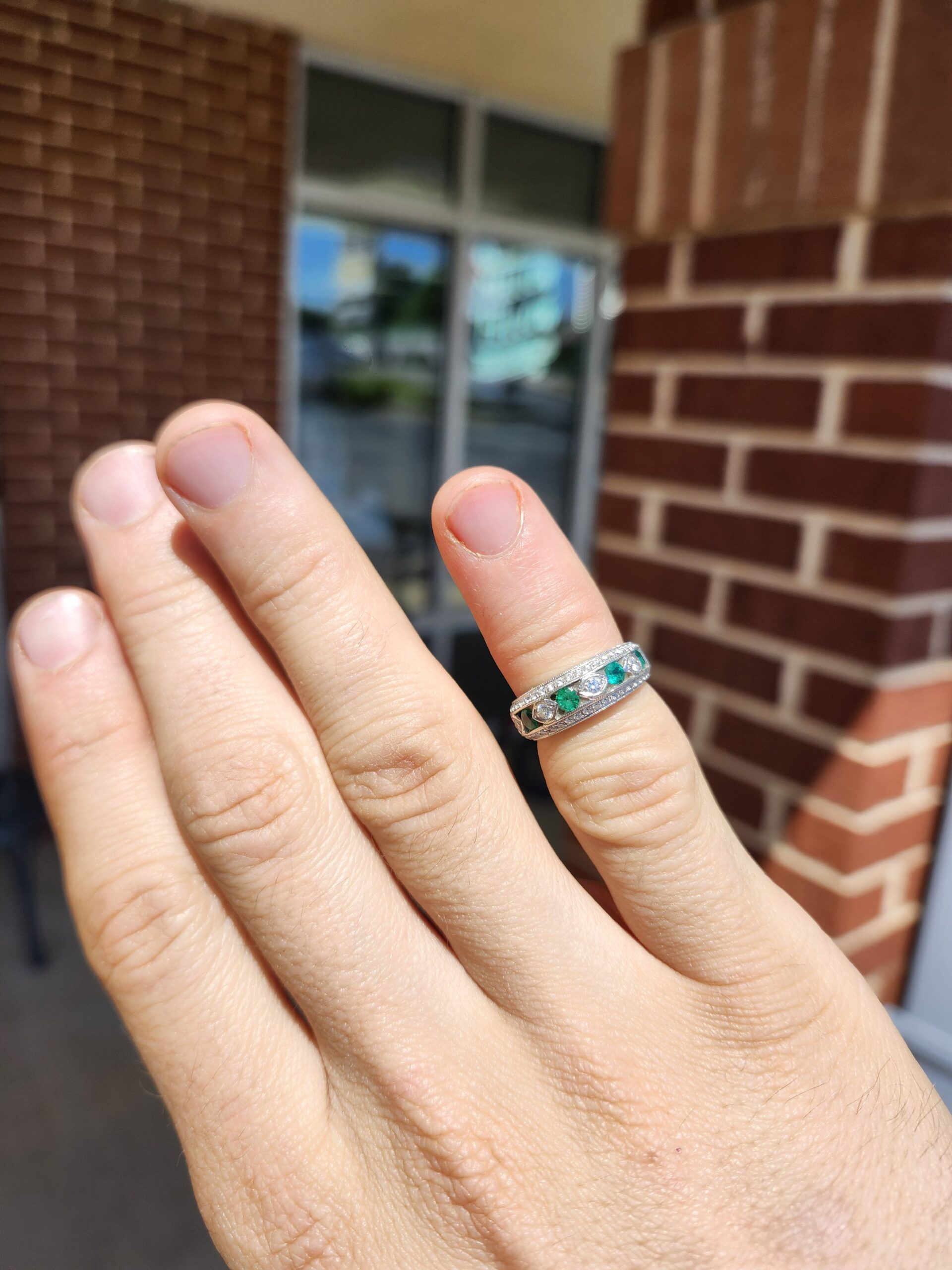 White gold and chunky yet a smaller size. this ring has alternating diamonds and Emeralds in the face and a row of natural diamonds above and below that too!