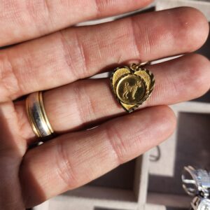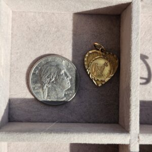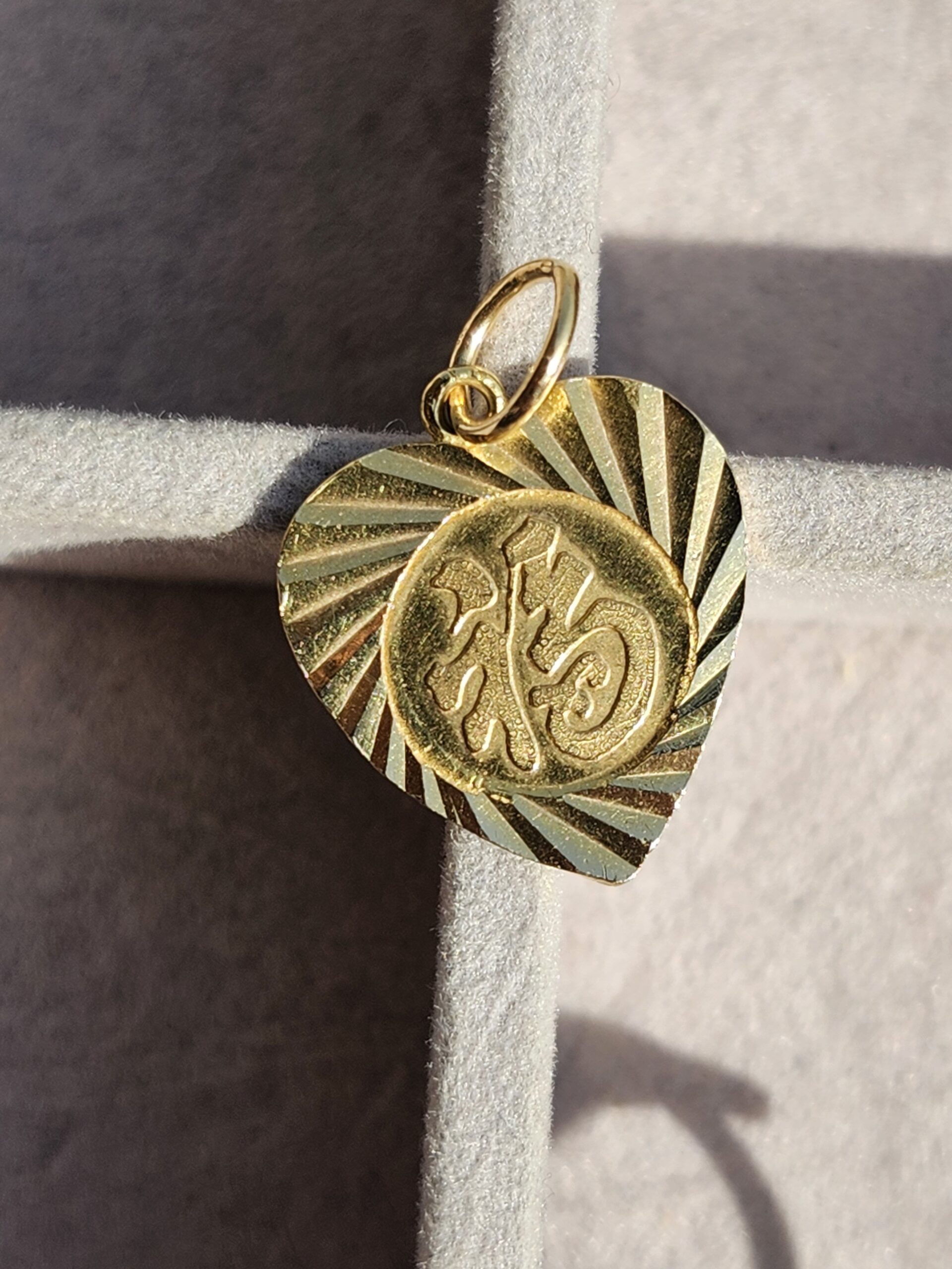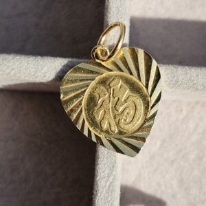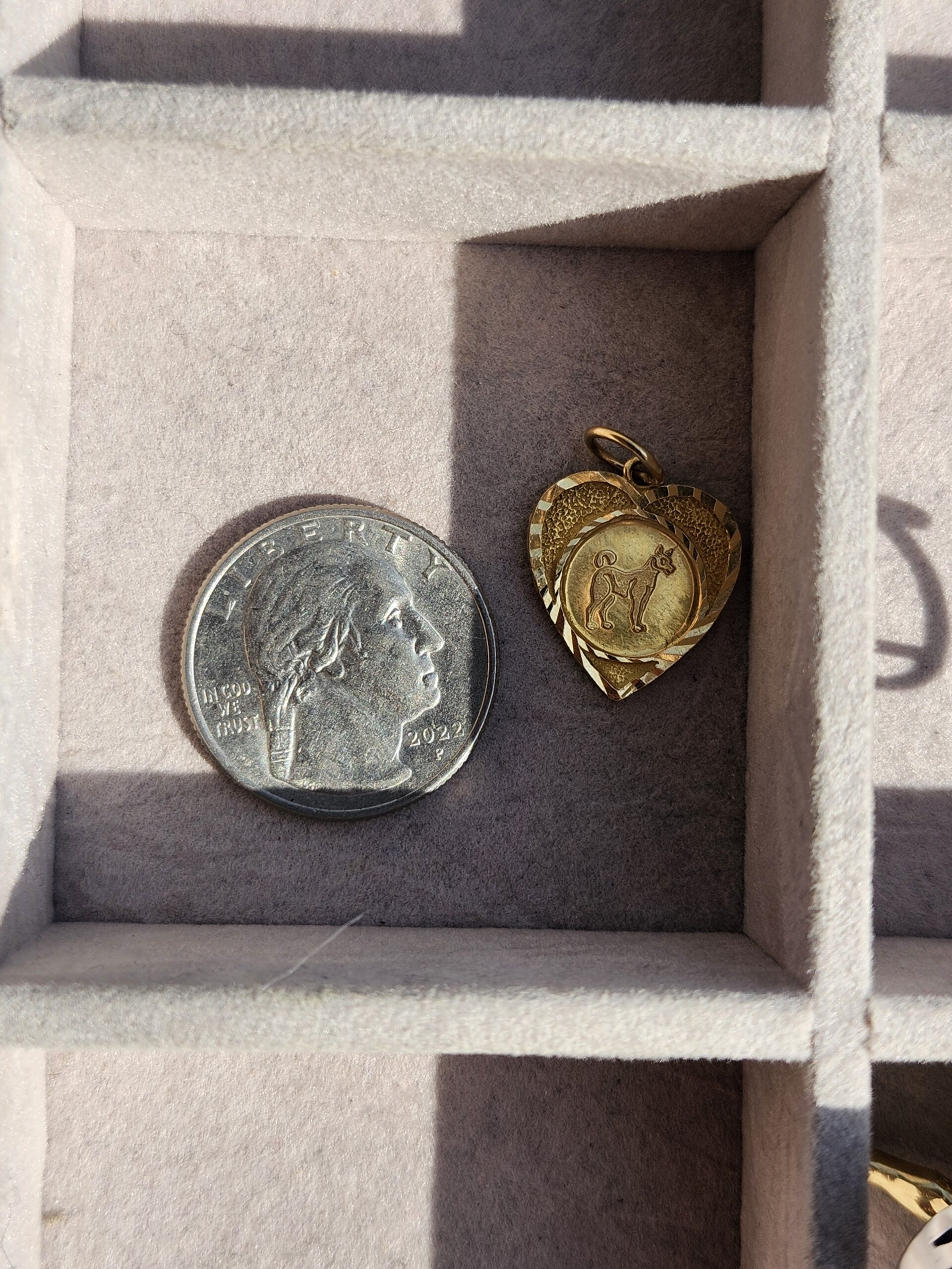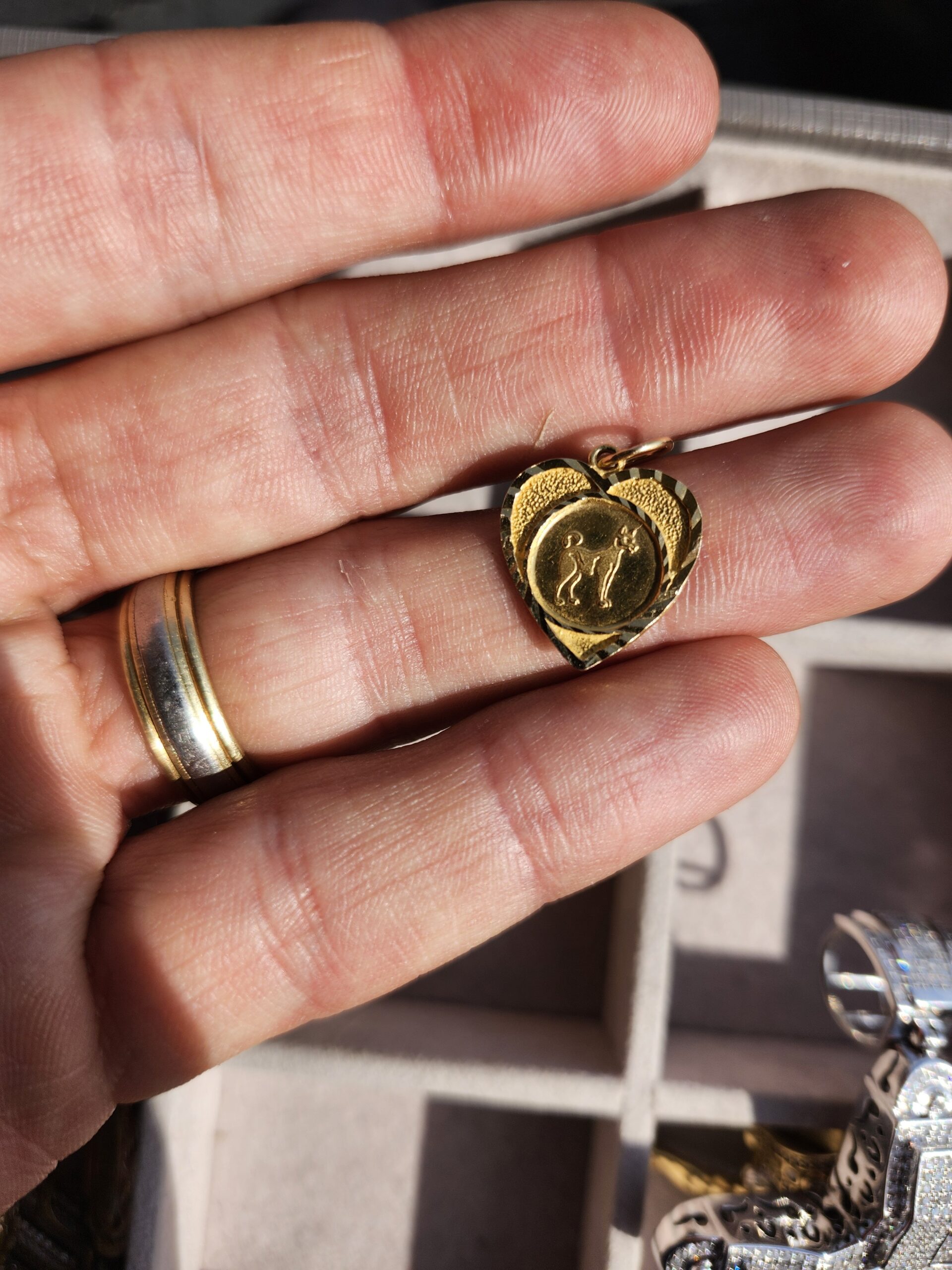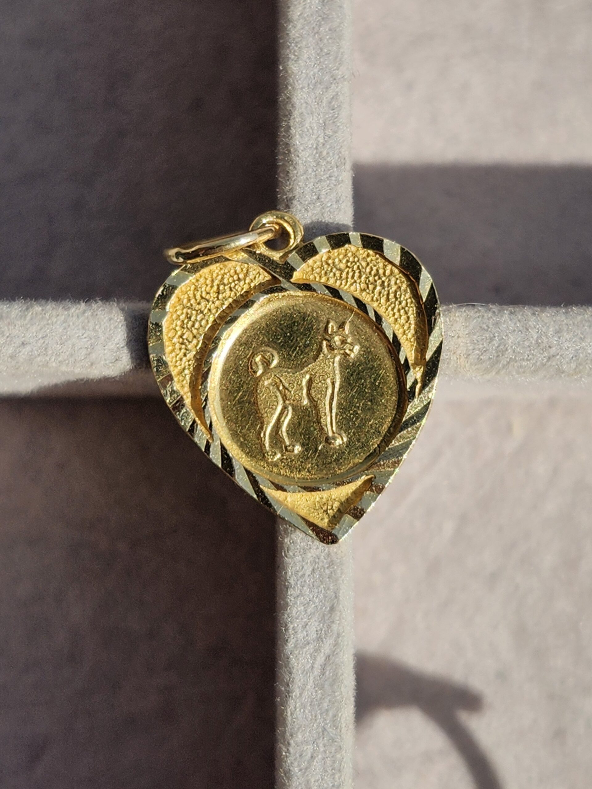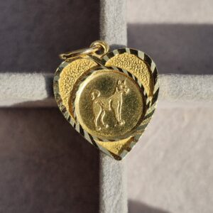 a dog on one side and Arabic on the back in the shape of a heart made from 22k gold