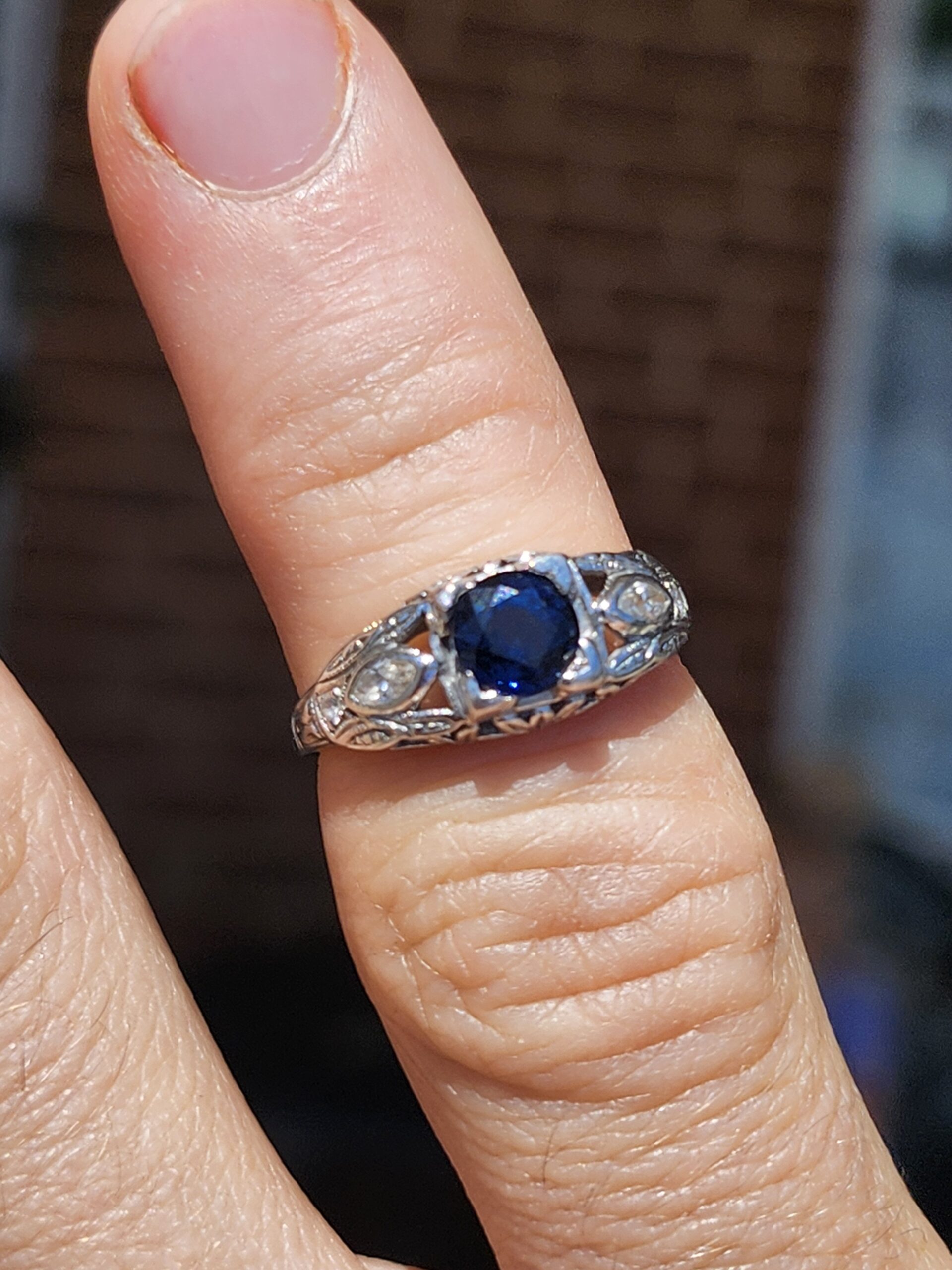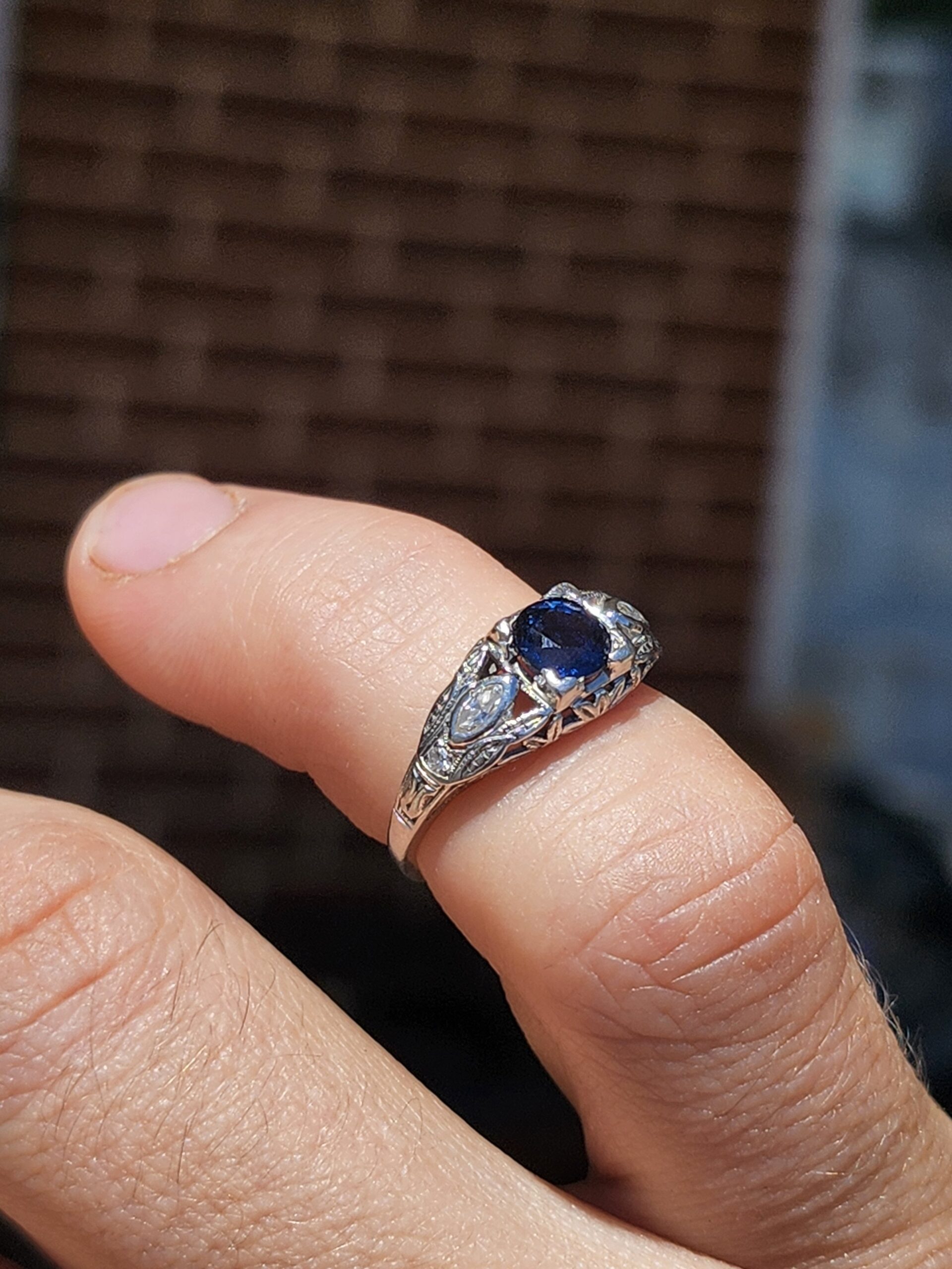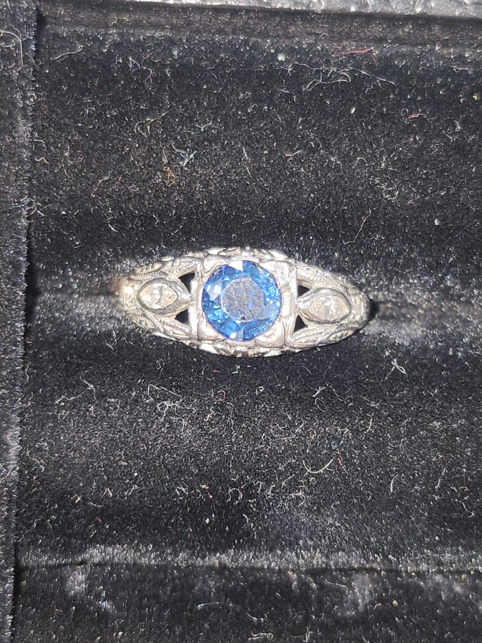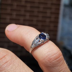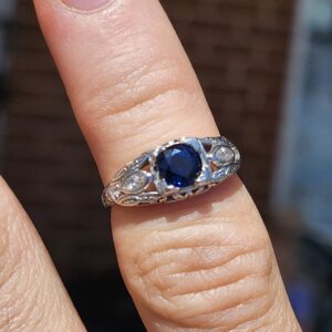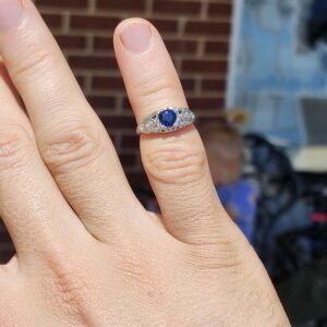 platinum vintage style ring with small diamonds on either side and a deep blue sapphire (approximately 0.65 carats) at the center