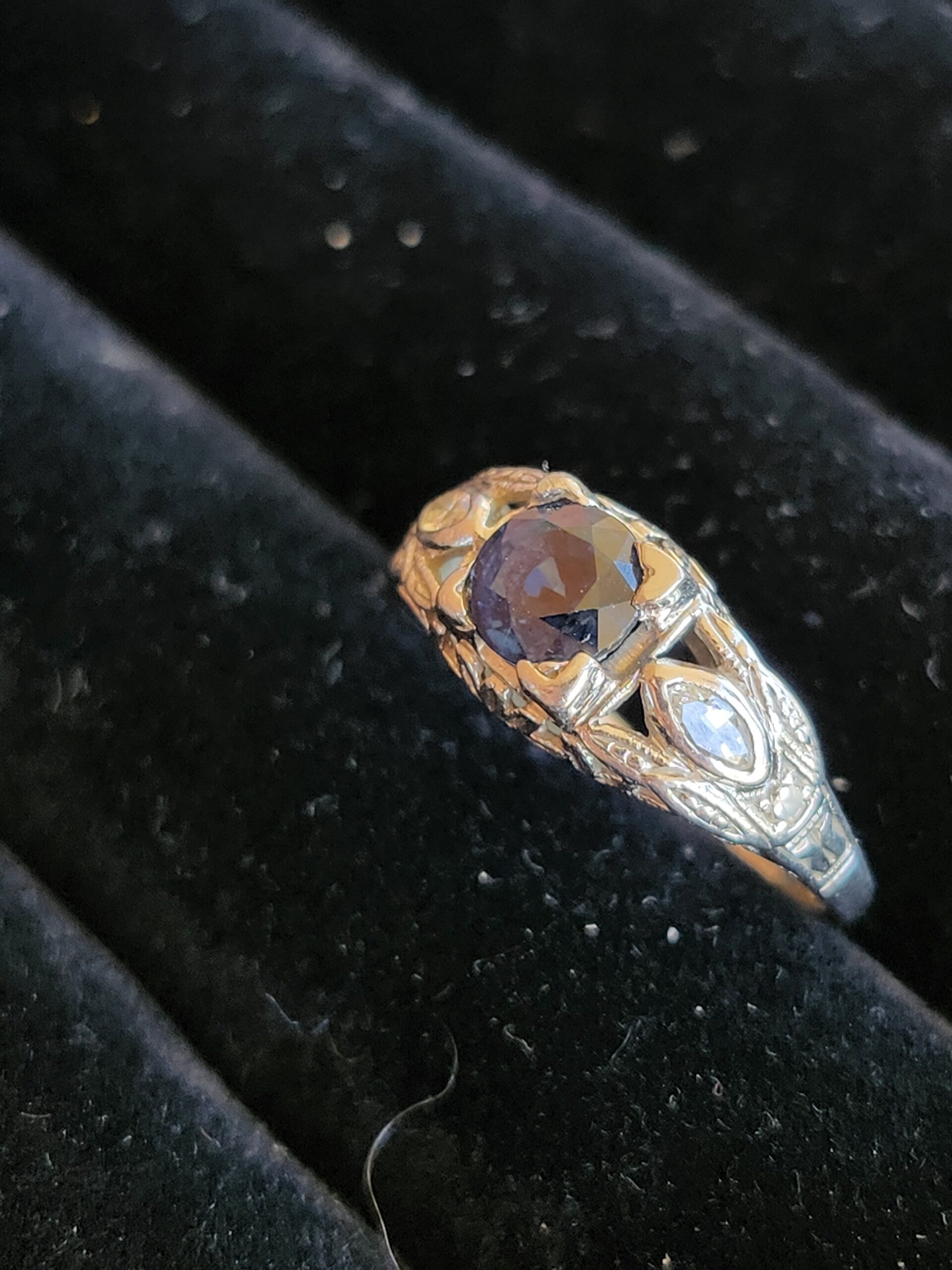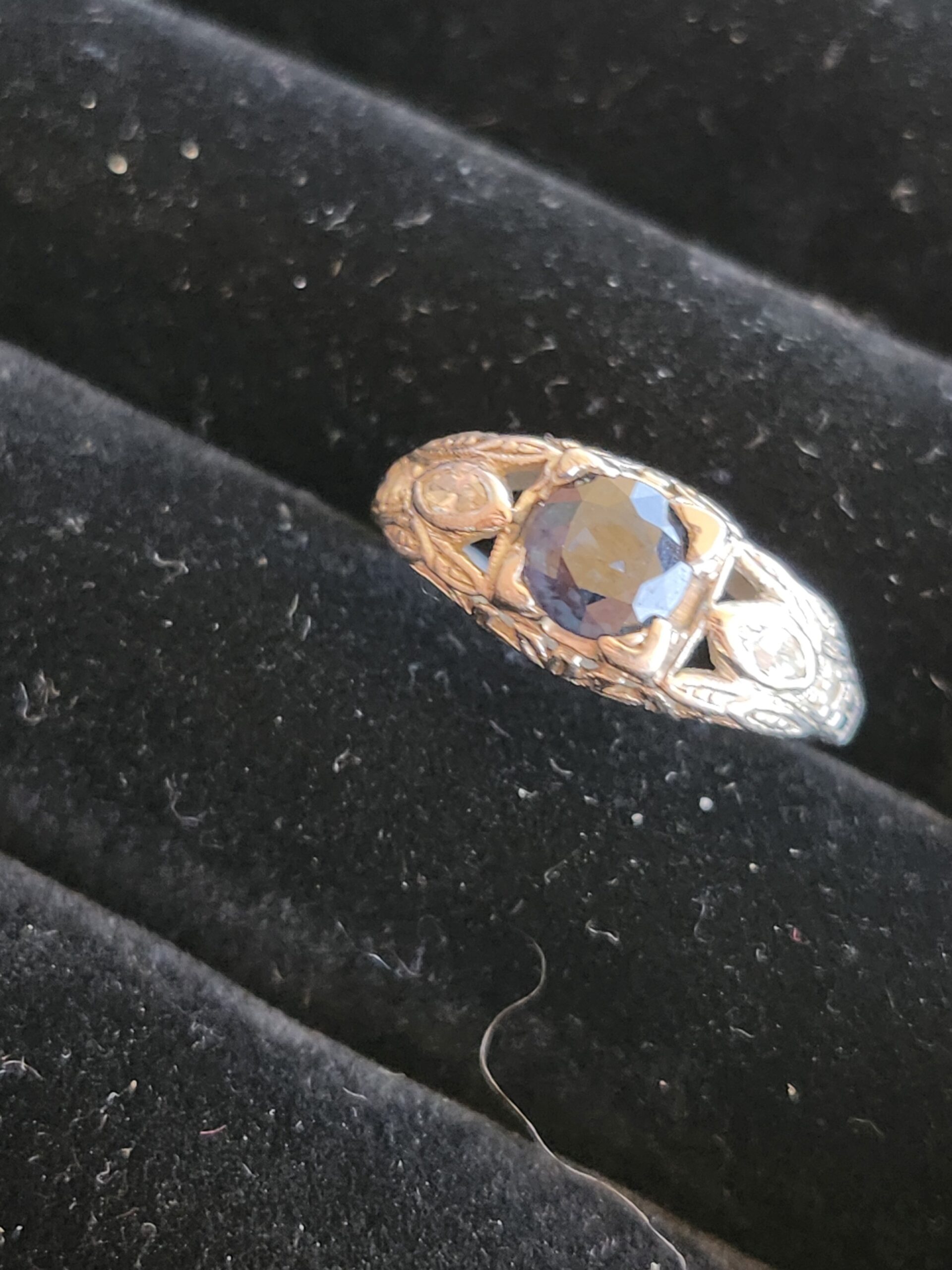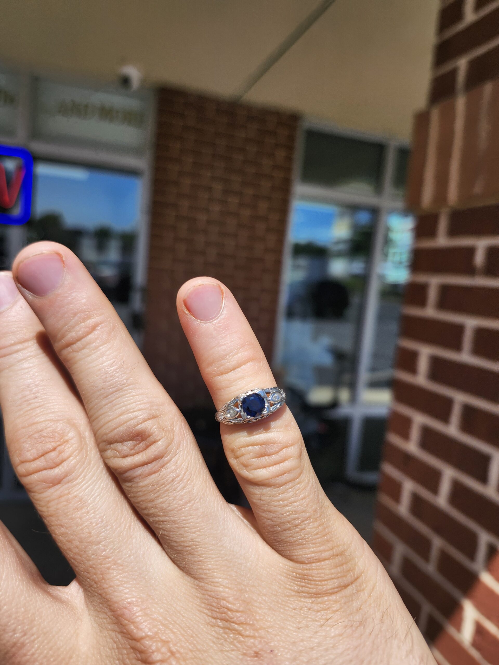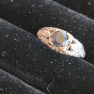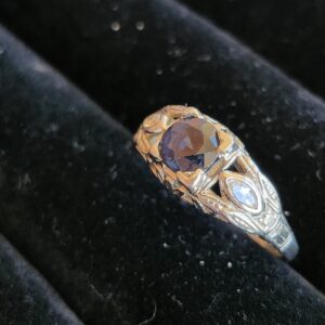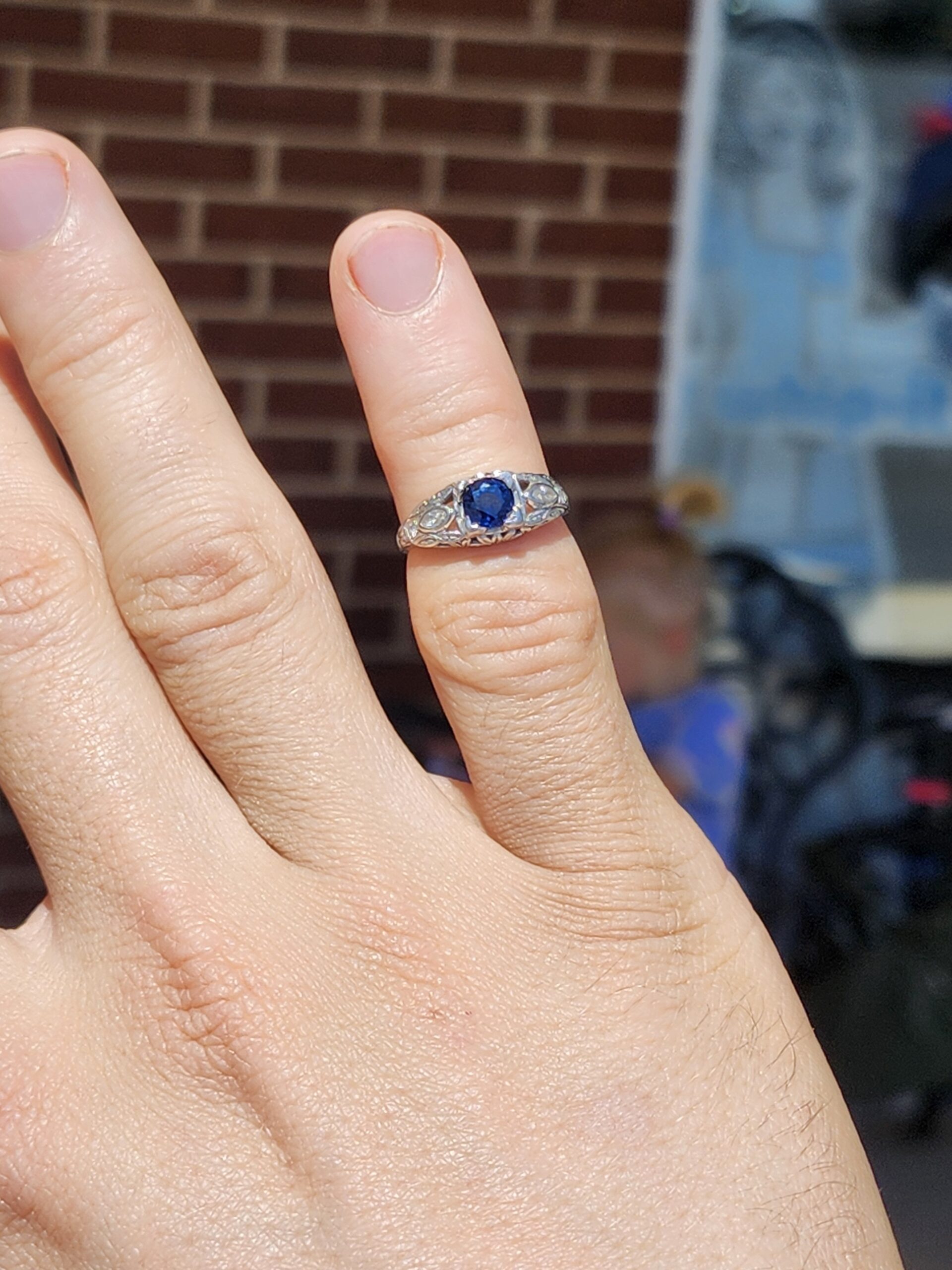 platinum vintage style ring with small diamonds on either side and a deep blue sapphire (approximately 0.65 carats) at the center