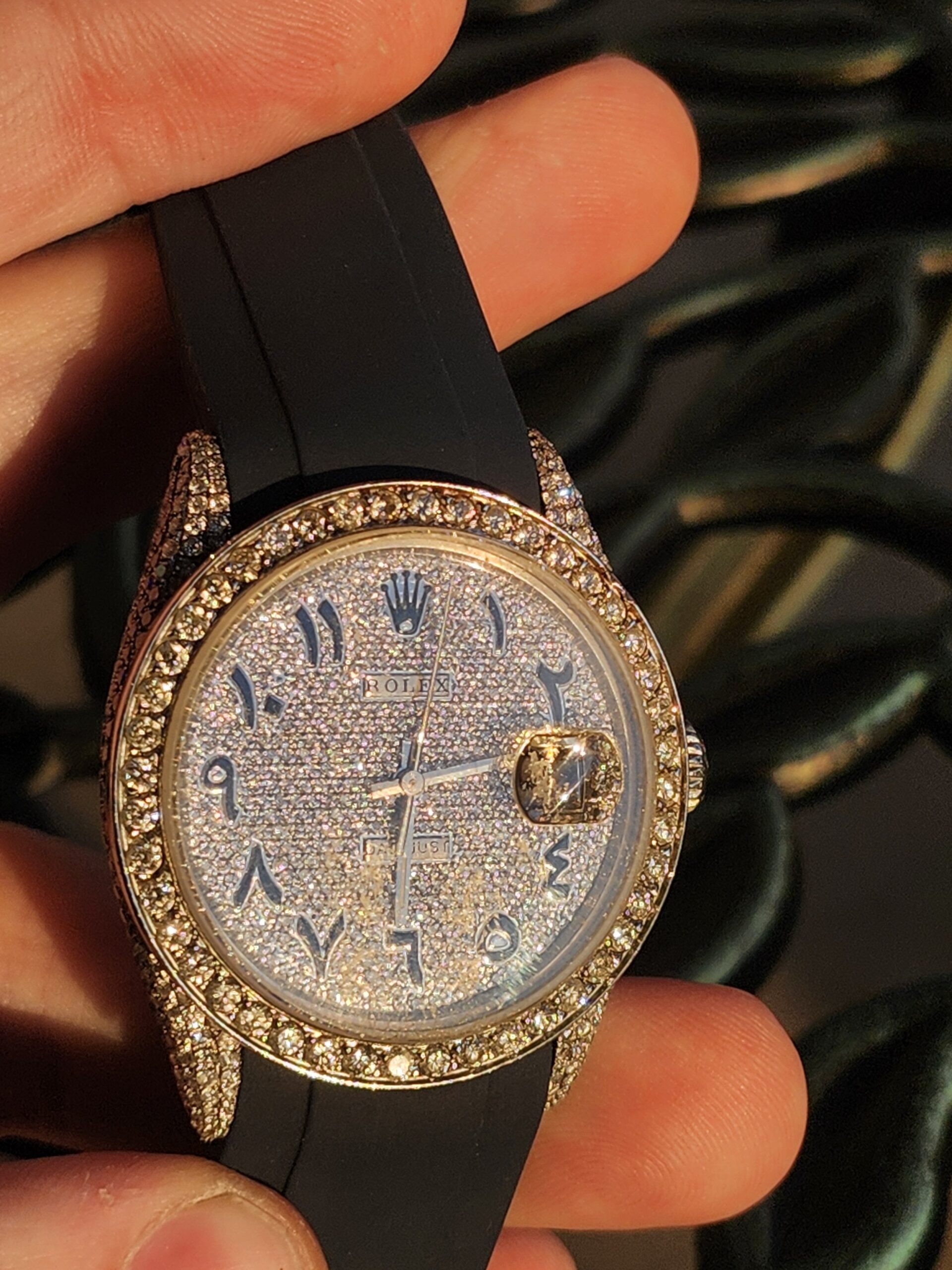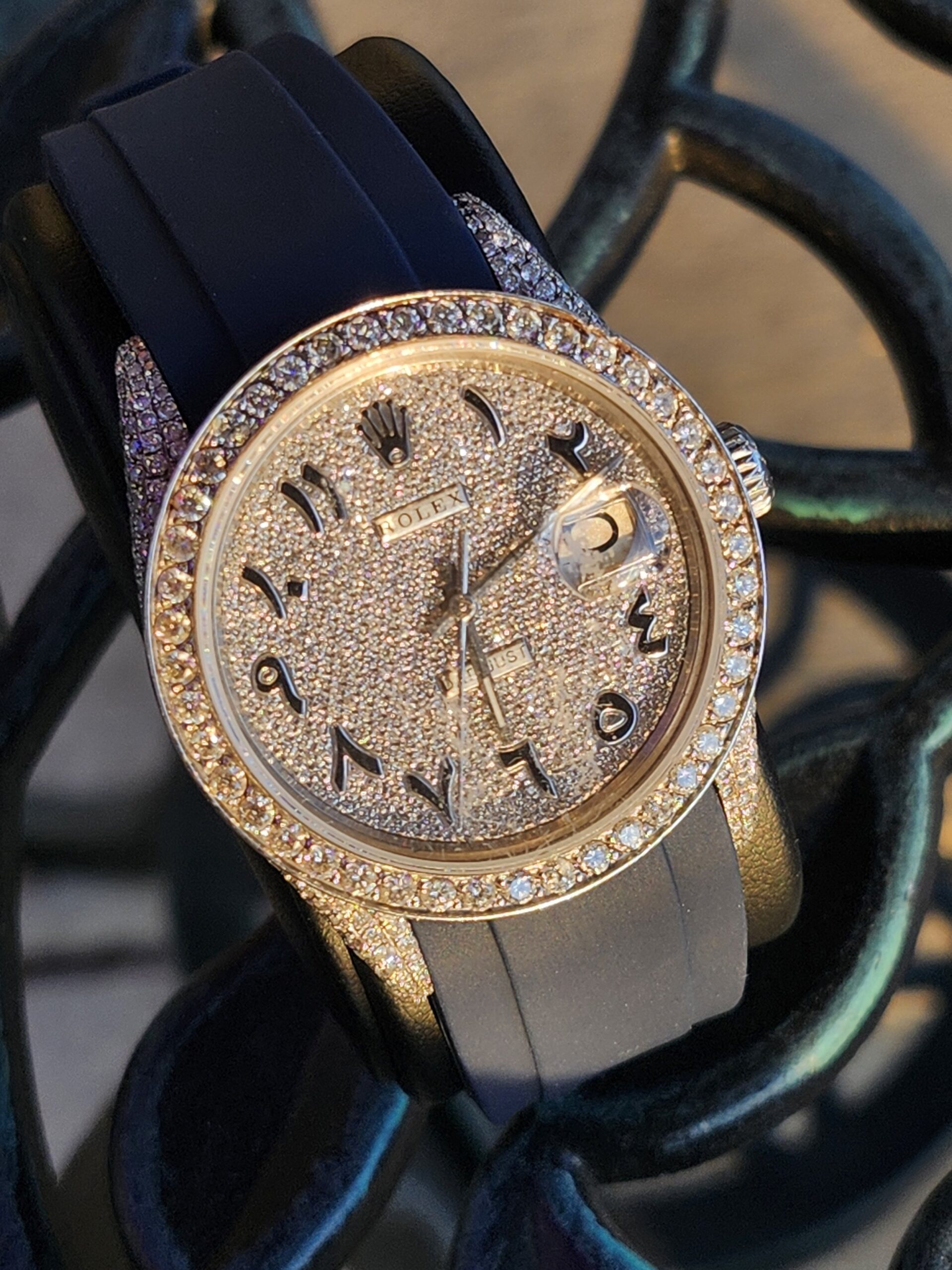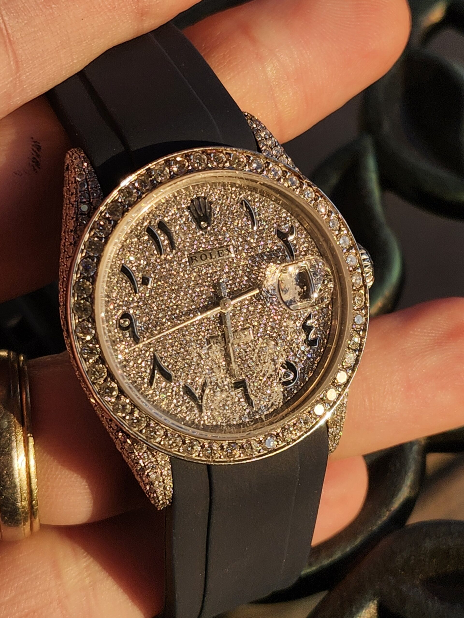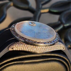 This watch was fully serviced, re-finished, and flooded with 24.5 carats of natural SI-VS diamonds in 2020.