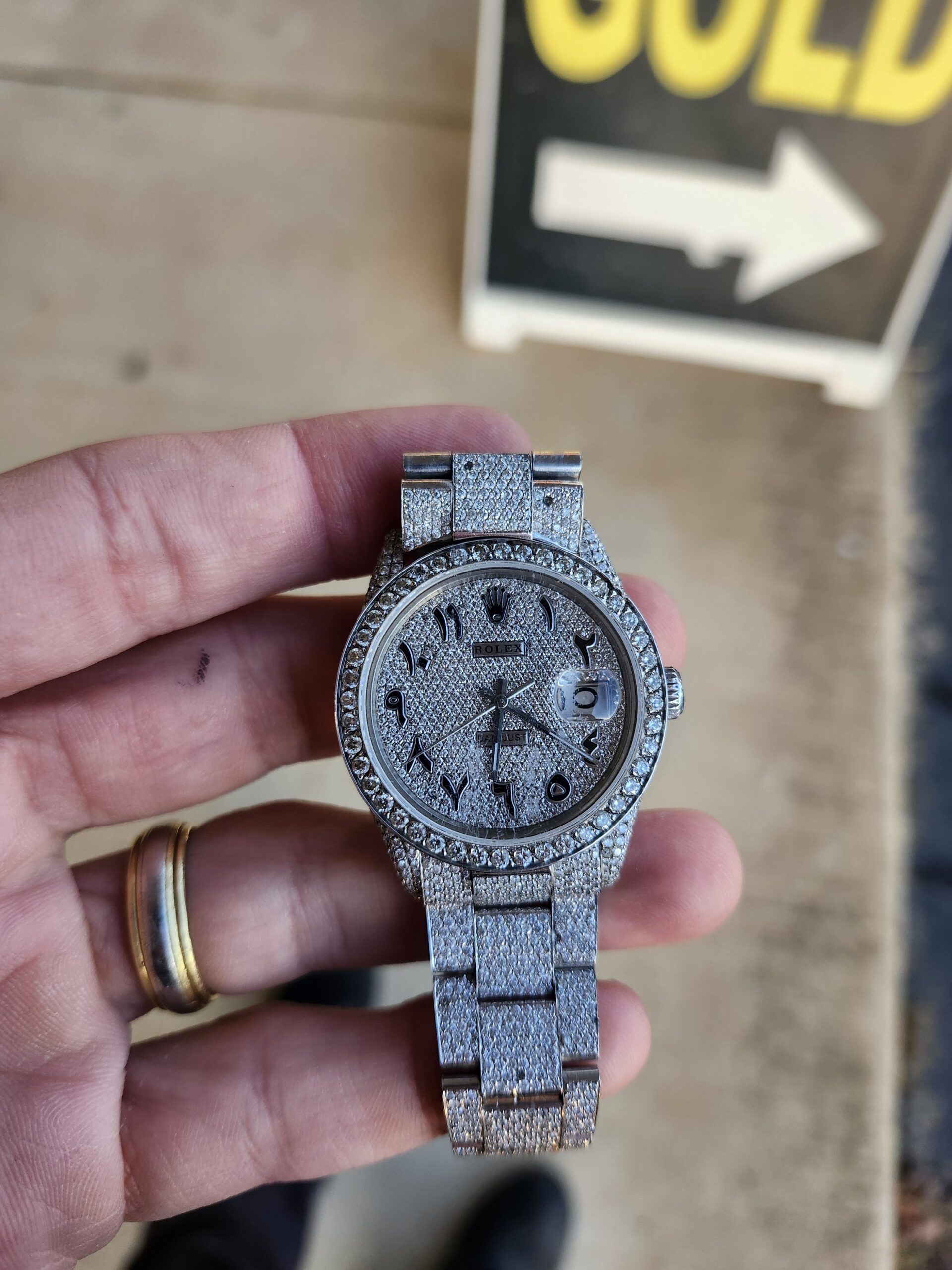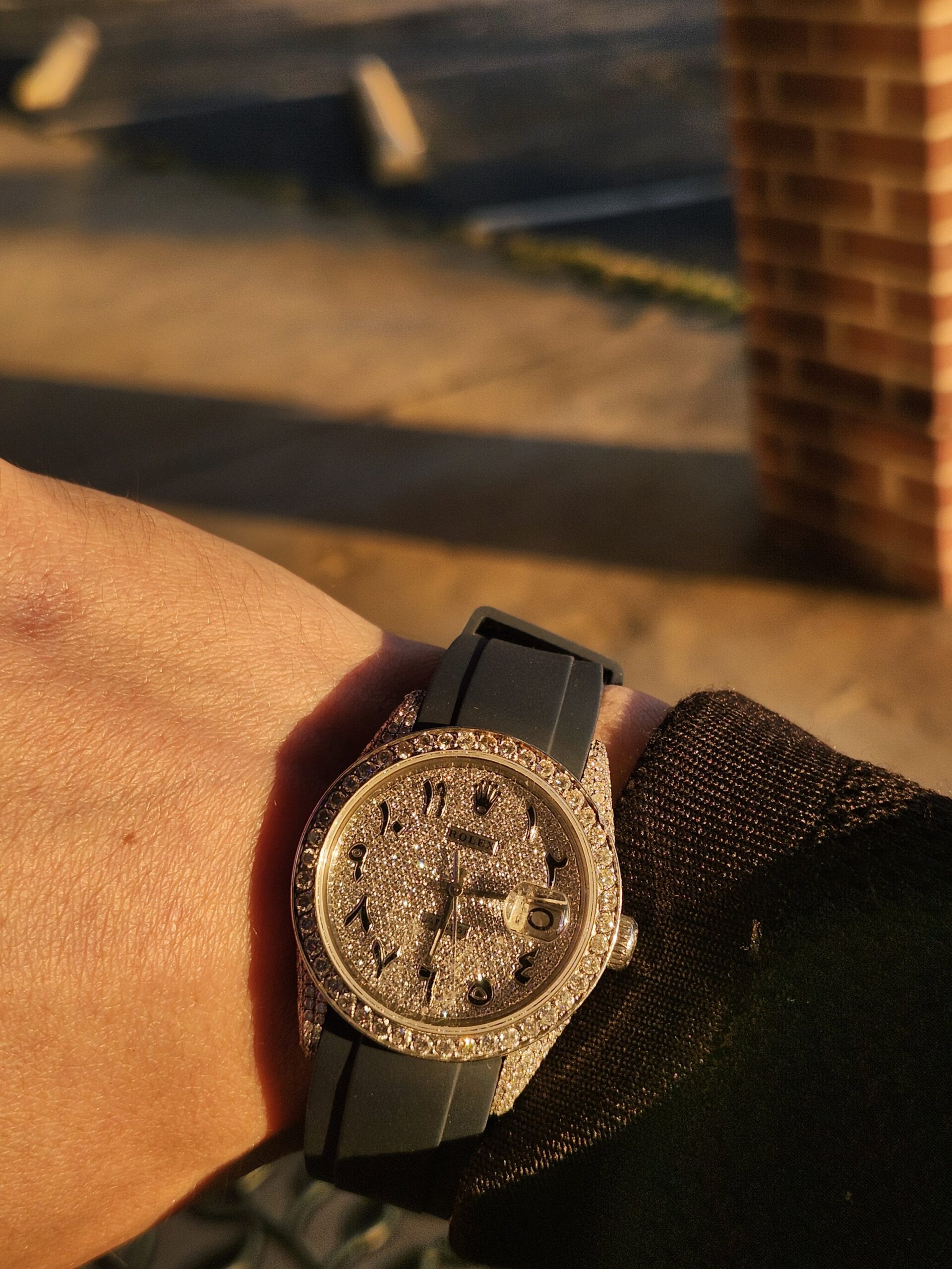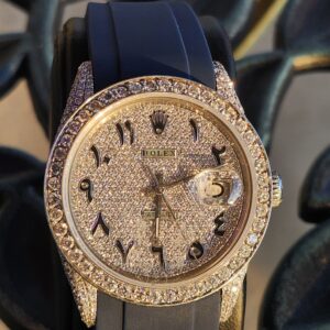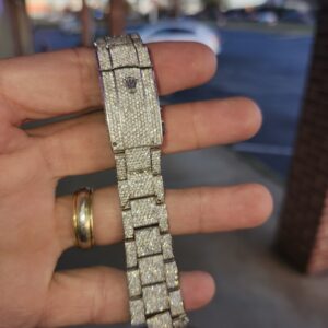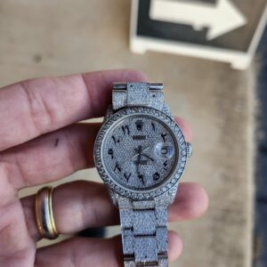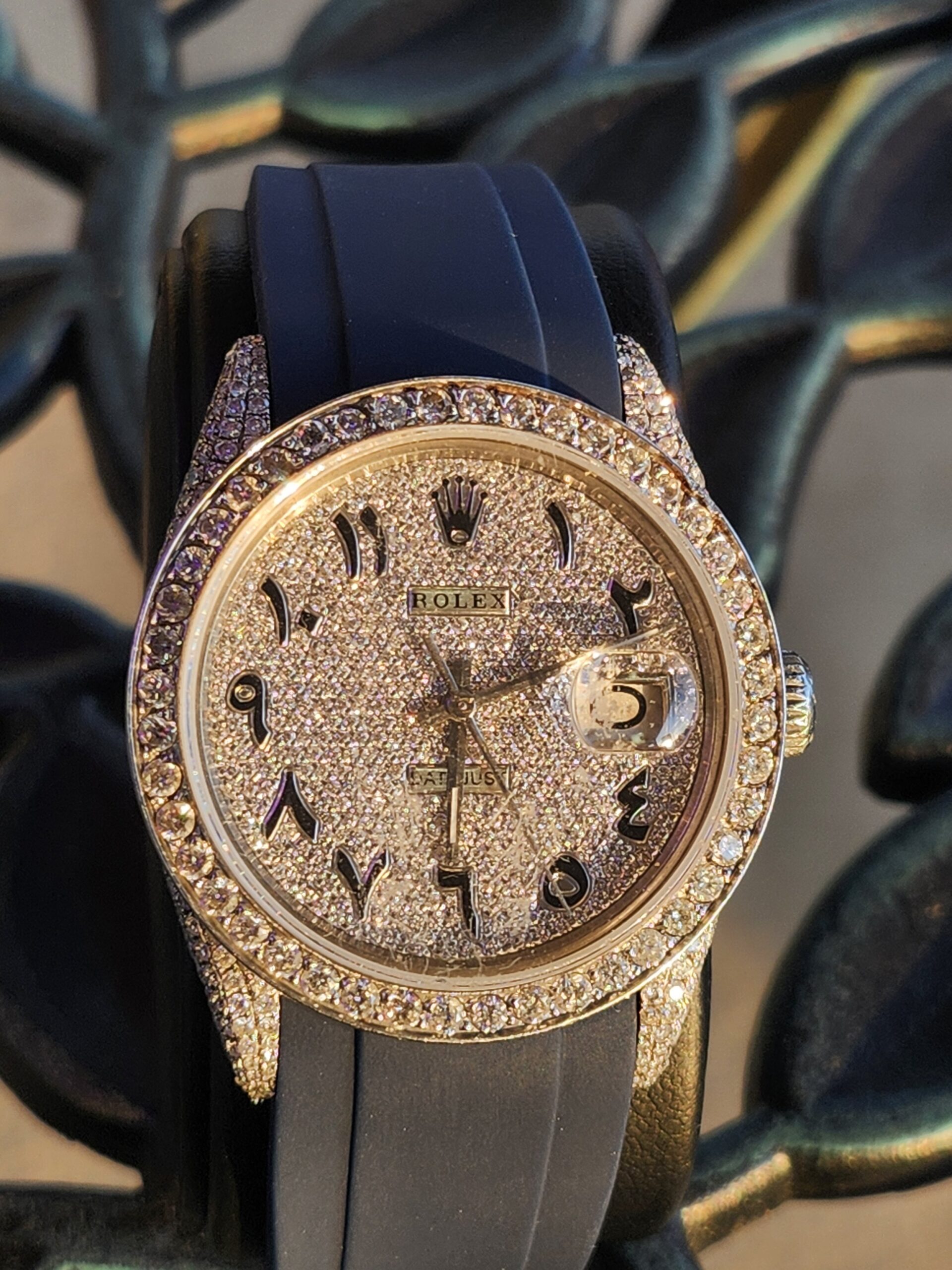 This watch was fully serviced, re-finished, and flooded with 24.5 carats of natural SI-VS diamonds in 2020.