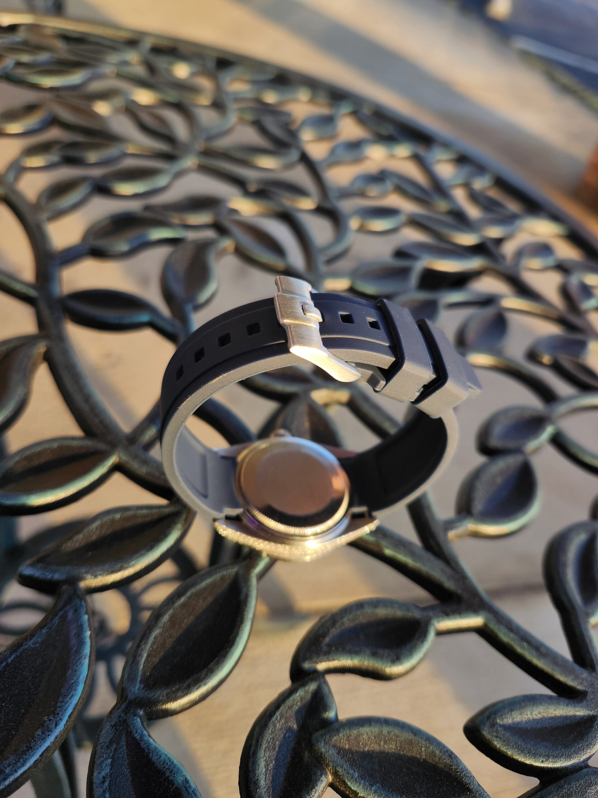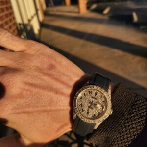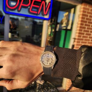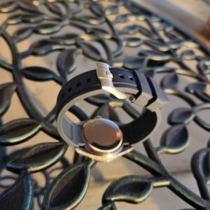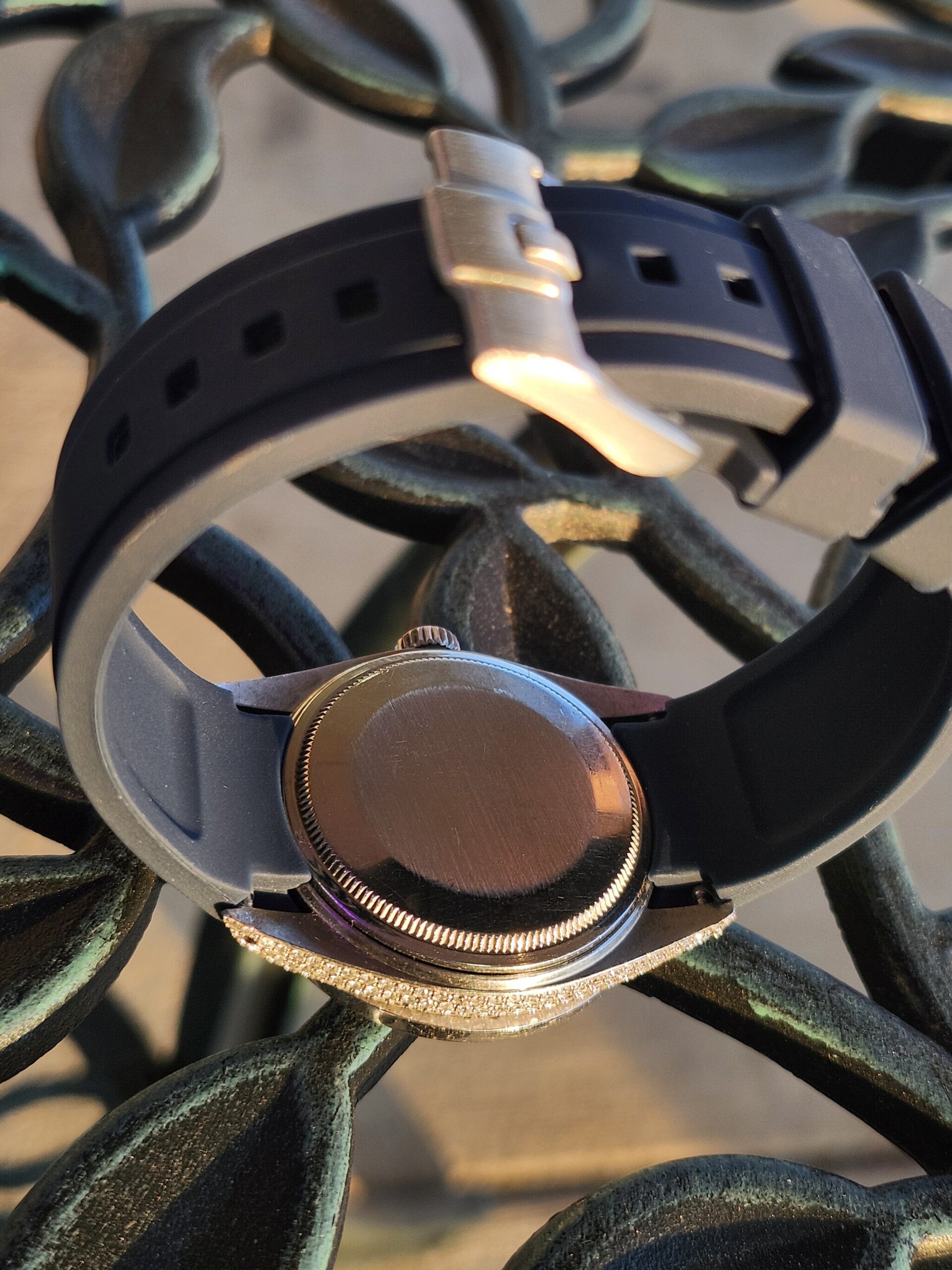 The watch band is missing a few stones and looks great on this navy-blue silicone band, but either option is available on your preference.