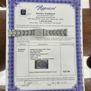 In the appraisal we can see that 24.5 carats of natural VS2-SI1 diamonds are in this piece with G-H color and 36mm watch head.